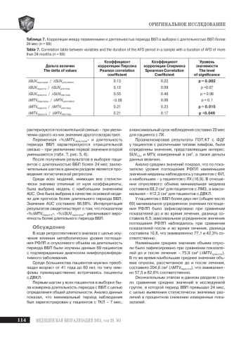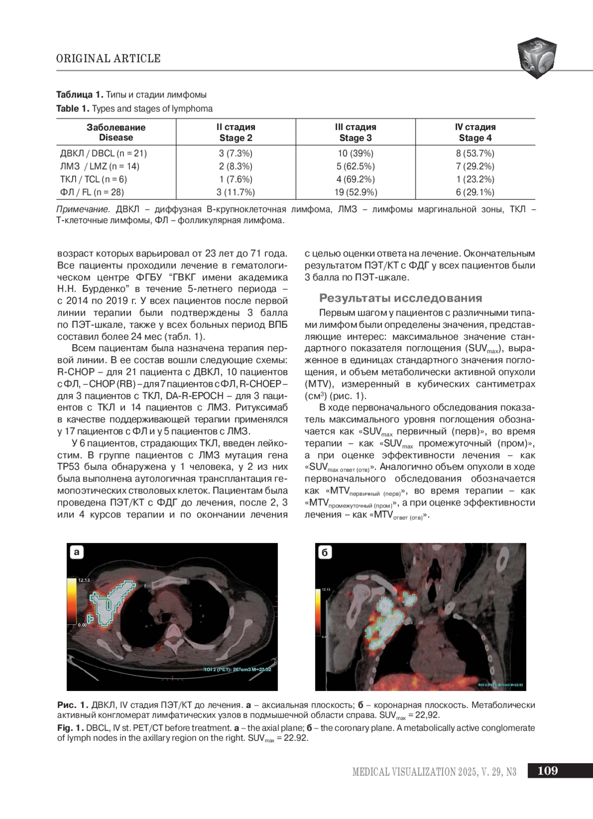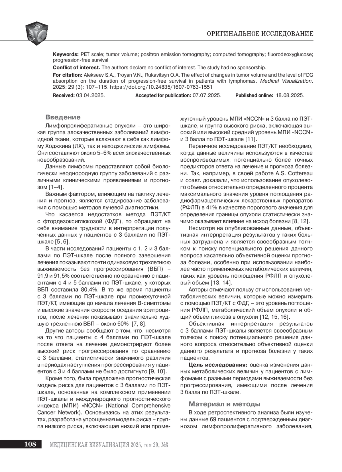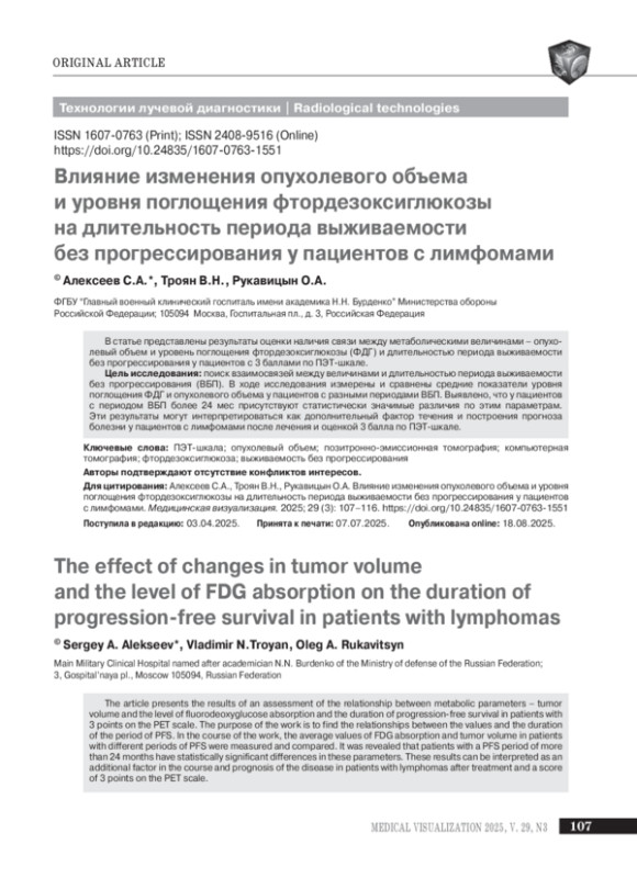 В статье представлены результаты оценки наличия связи между метаболическими величинами – опухолевый объем и уровень поглощения фтордезоксиглюкозы (ФДГ) и длительностью периода выживаемости без прогрессирования у пациентов с 3 баллами по ПЭТ-шкале.