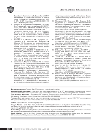 2. Галченко Л.И., Демченкова М.В., Павлюк И.А., Толстой Д.А., Калягин А.Н., Виноградов В.Г. Позитронно-эмиссионная томография в диагностике и оценке эффективности лечения лимфомы Ходжкина. Медицина и высокие технологии. 2022; 3: 51-57. DOI: 10.34219/2306-3645-2022-12-3-51-57