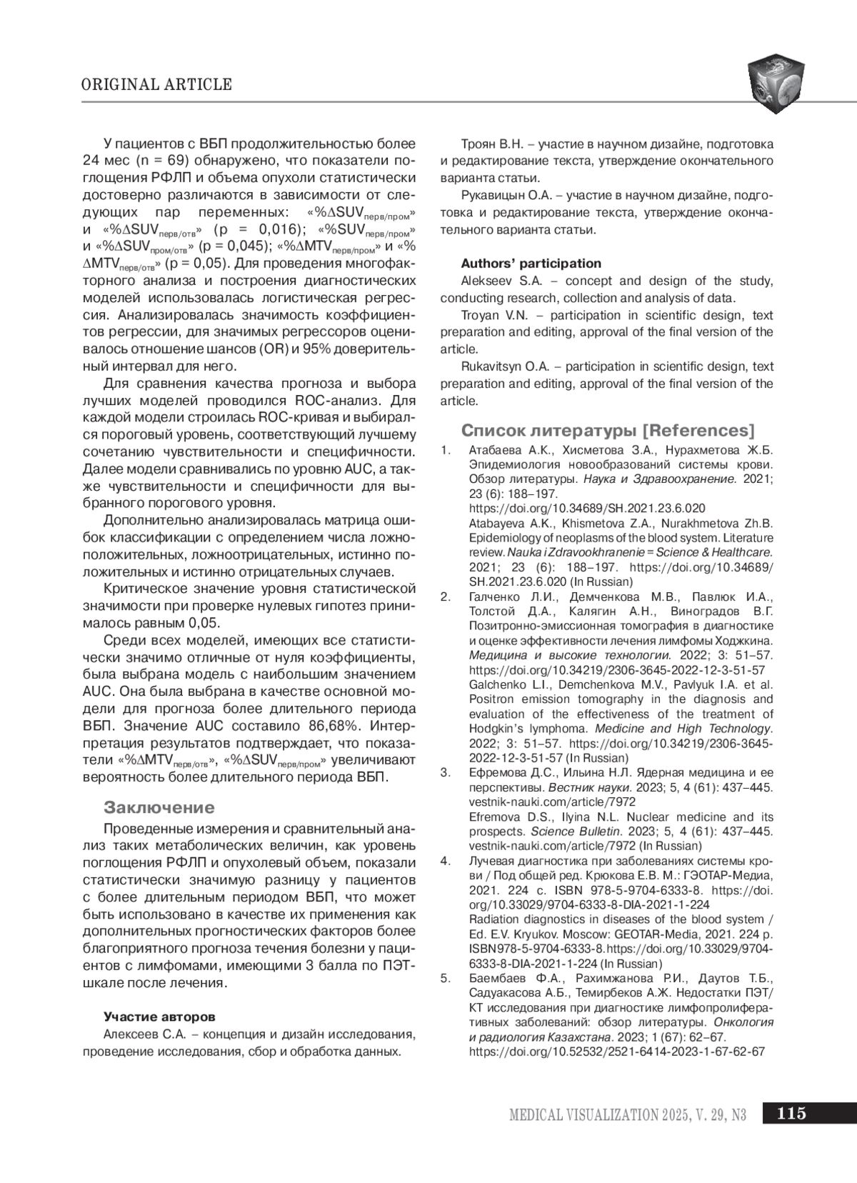 7. Асланиди И.П., Метелкина М.В., Мухортова О.В., Пурсанова Д.М., Шурупова И.В., Манукова В.А. Объмные ПЭТ-биомаркеры при лимфоме Ходжкина. первый опыт автоматического и ручного методов оценки. Российский электронный журнал лучевой диагностики. 2022; 12(1): 80-88. DOI: 10.21569/2222-7415-2022-12-1-80-88