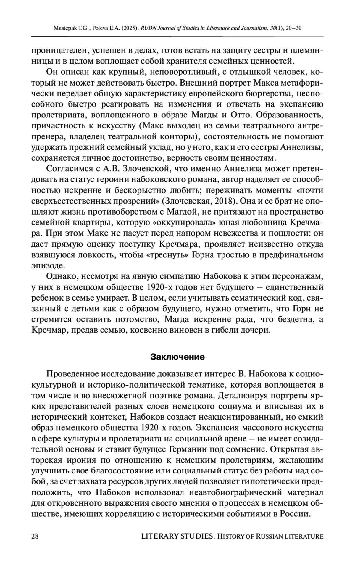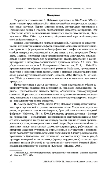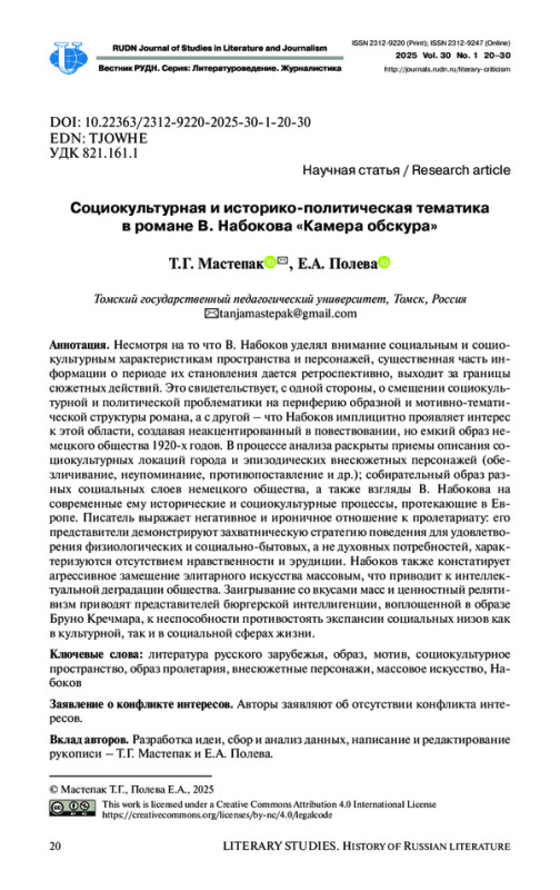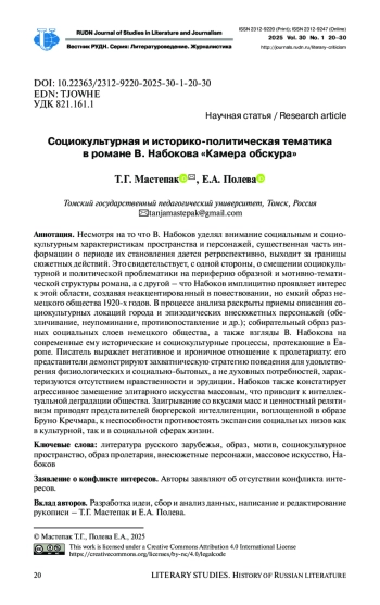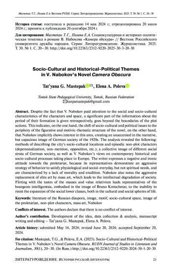 Несмотря на то что В. Набоков уделял внимание социальным и социокультурным характеристикам пространства и персонажей, существенная часть информации о периоде их становления дается ретроспективно, выходит за границы сюжетных действий. Это свидетельствует, с одной стороны, о смещении социокультурной и политической проблематики на периферию образной и мотивно-тематической структуры романа, а с другой - что Набоков имплицитно проявляет интерес к этой области, создавая неакцентированный в повествовании, но емкий образ немецкого общества 1920-х годов. В процессе анализа раскрыты приемы описания социокультурных локаций города и эпизодических внесюжетных персонажей (обезличивание, неупоминание, противопоставление и др.); собирательный образ разных социальных слоев немецкого общества, а также взгляды В. Набокова на современные ему исторические и социокультурные процессы, протекающие в Европе. Писатель выражает негативное и ироничное отношение к пролетариату: его представители демонстрируют захватническую стратегию поведения для удовлетворения физиологических и социально-бытовых, а не духовных потребностей, характеризуются отсутствием нравственности и эрудиции. Набоков также констатирует агрессивное замещение элитарного искусства массовым, что приводит к интеллектуальной деградации общества. Заигрывание со вкусами масс и ценностный релятивизм приводят представителей бюргерской интеллигенции, воплощенной в образе Бруно Кречмара, к неспособности противостоять экспансии социальных низов как в культурной, так и в социальной сферах жизни.