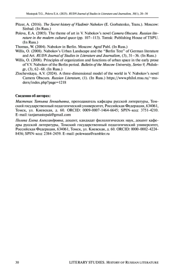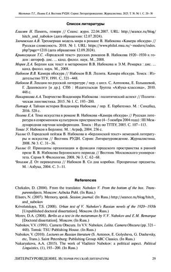 3. Криволуцкая Т.С. “Городской текст” русских романов В. Набокова 1920-1930-х годов: автореф. дис.... канд. филол. наук. М., 2008. EDN: NKMOYV