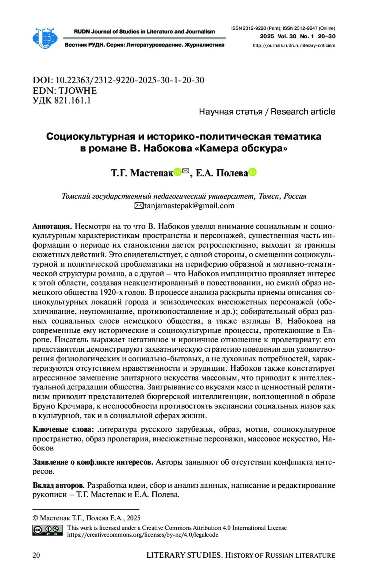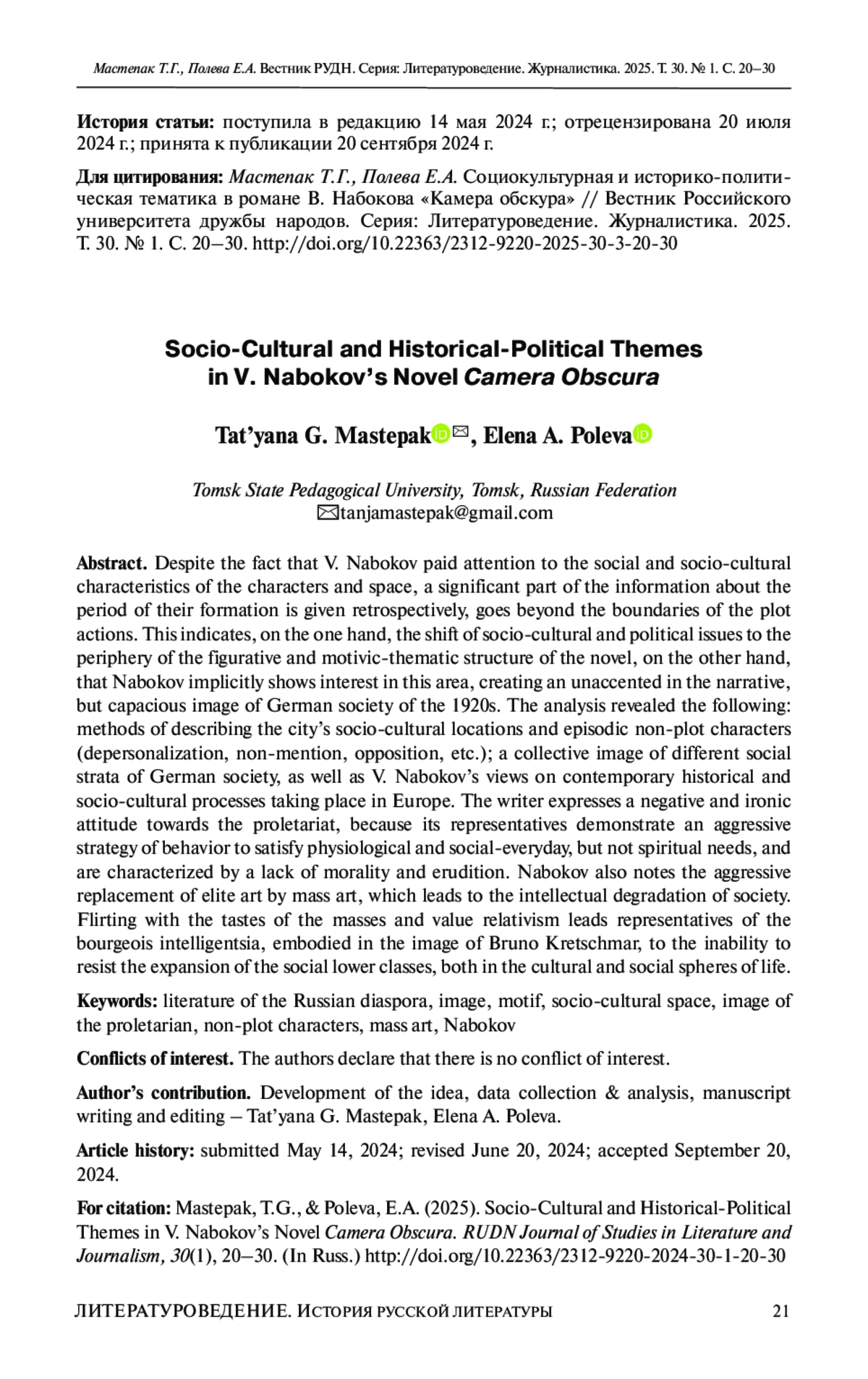 7. Накарякова А.А. Творчество Владимира Набокова: политический аспект // Политическая лингвистика. 2015. № 1. С. 193-200. EDN: TWGEKN