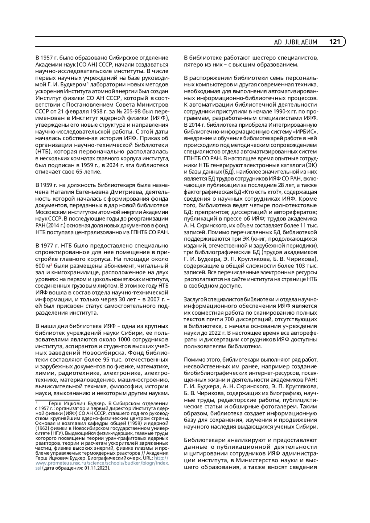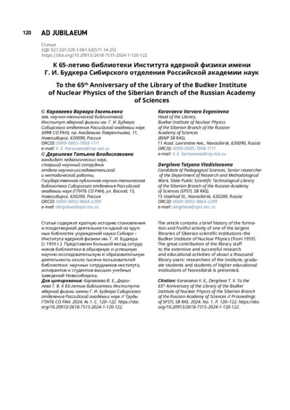 Статья содержит краткую историю становления и плодотворной деятельности одной из крупных библиотек учреждений науки Сибири – Института ядерной физики им. Г. И. Будкера (с 1959 г.). Представлен большой вклад сотрудников библиотеки в обширную и успешную научно-исследовательскую и образовательную деятельность около тысячи пользователей библиотеки: научных сотрудников института, аспирантов и студентов высших учебных заведений Новосибирска.