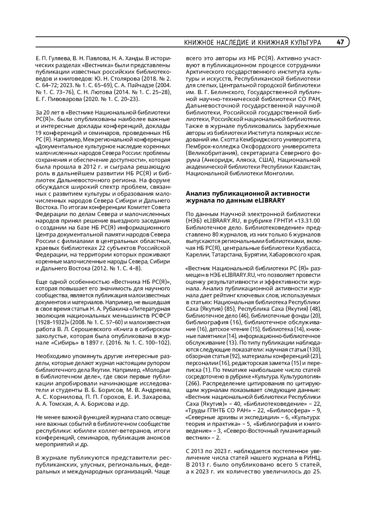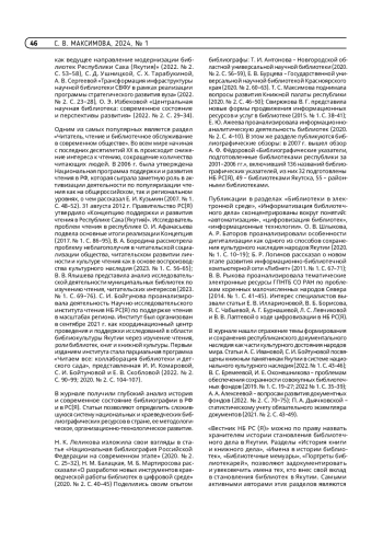 По данным Научной электронной библиотеки (НЭБ) eLIBRARY. RU, в рубрике ГРНТИ «13.31.00 Библиотечное дело. Библиотековедение» представлено 80 журналов, из них только 6 журналов выпускаются региональными библиотеками, включая НБ РС(Я), центральные библиотеки Кузбасса, Карелии, Татарстана, Бурятии, Хабаровского края.