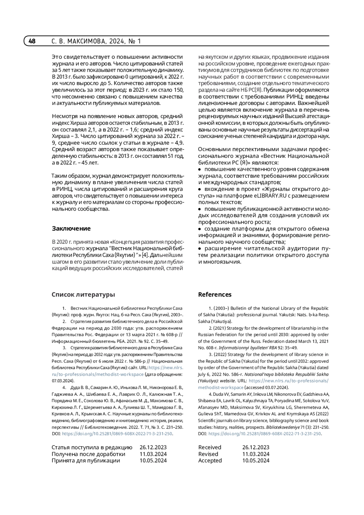 4. Дуда В. В., Самарин А. Ю., Инькова Л. М., Никонорова Е. В., Гаджиева А. А., Шибаева Е. А., Лаврик О. Л., Калюжная Т. А., Порядина М. Е., Соколова Ю. В., Афанасьев М. Д., Максимова С. В., Кирюхина Л. Г., Шереметьева А. А., Гулиева Ш. Т., Мамедова Г. В., Кривков А. Л., Крымская А. С. Научные журналы по библиотековедению, библиографоведению и книговедению: история, реалии, перспективы // Библиотековедение. 2022. Т. 71, № 3. С. 231-250. https://doi.org/10.25281/0869-608X-2022-71-3-231-250.