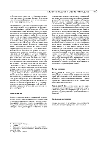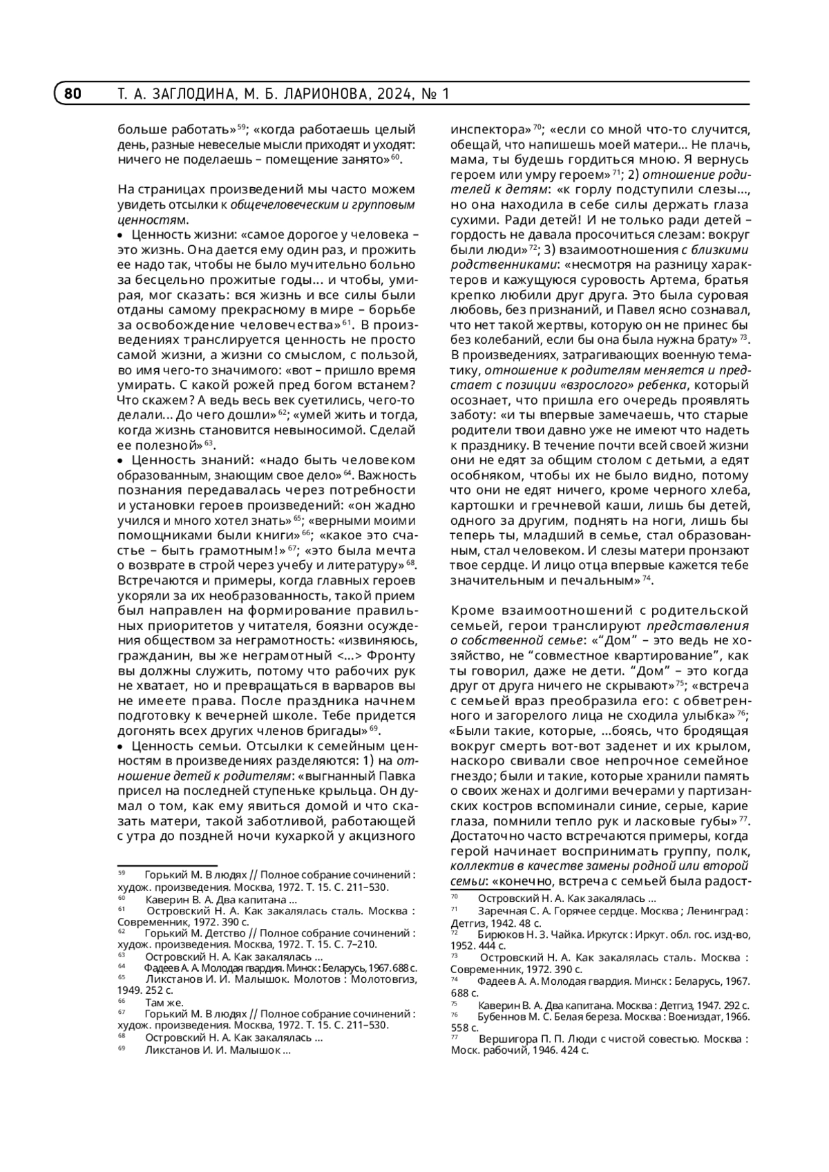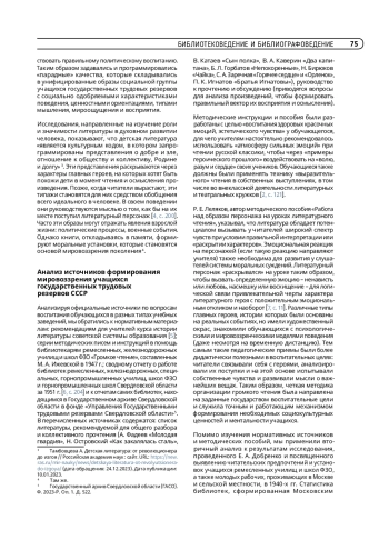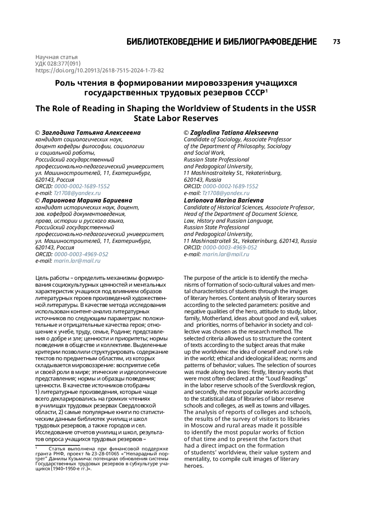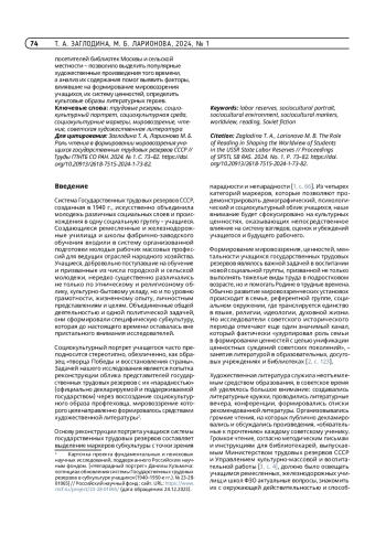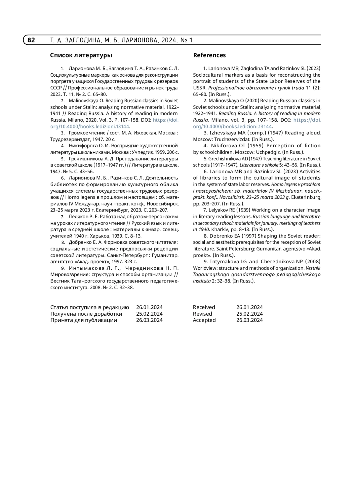 1. Ларионова М. Б., Заглодина Т. А., Разинков С. Л. Социокультурные маркеры как основа для реконструкции портрета учащихся Государственных трудовых резервов СССР // Профессиональное образование и рынок труда. 2023. Т. 11, № 2. С. 65-80.