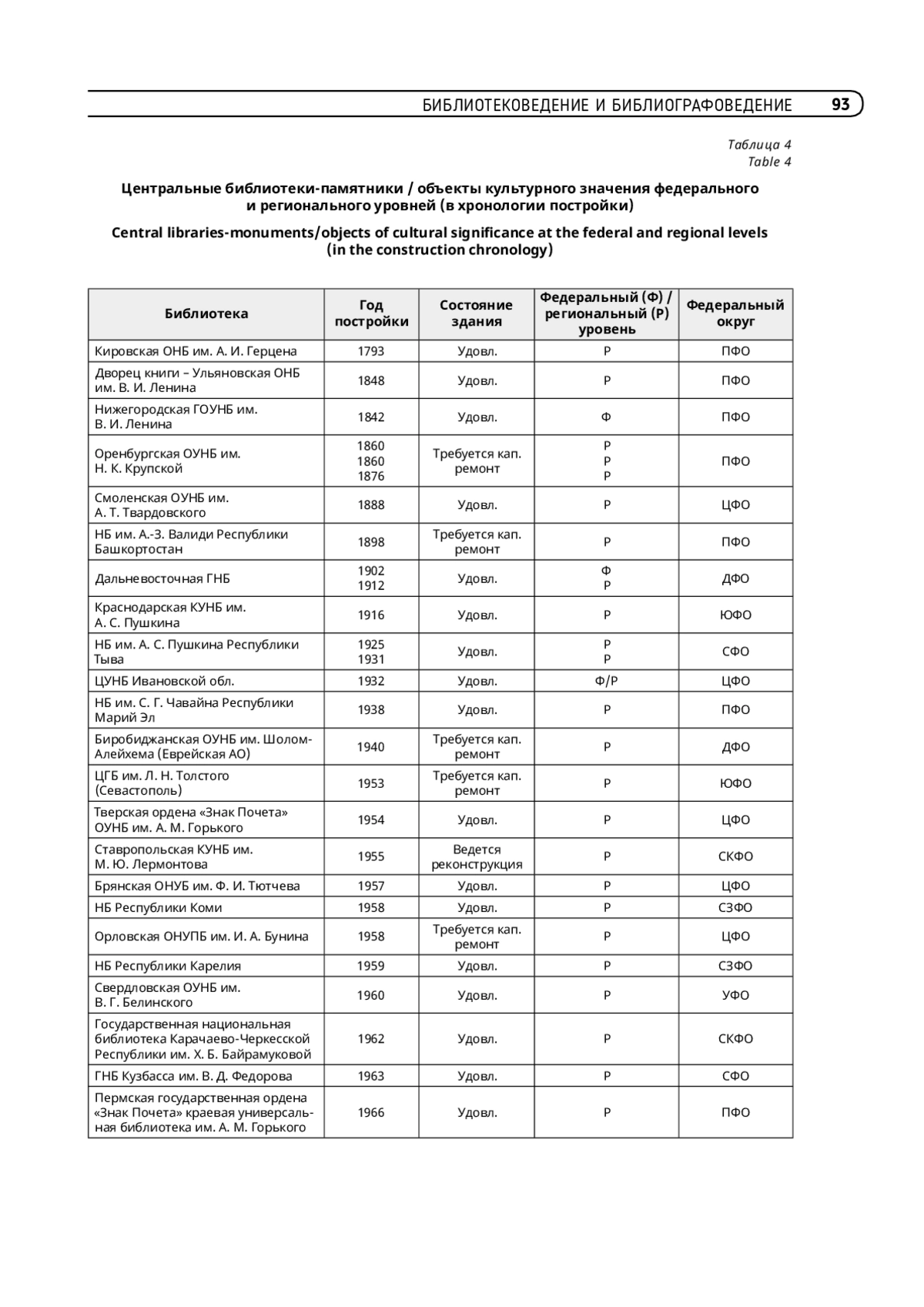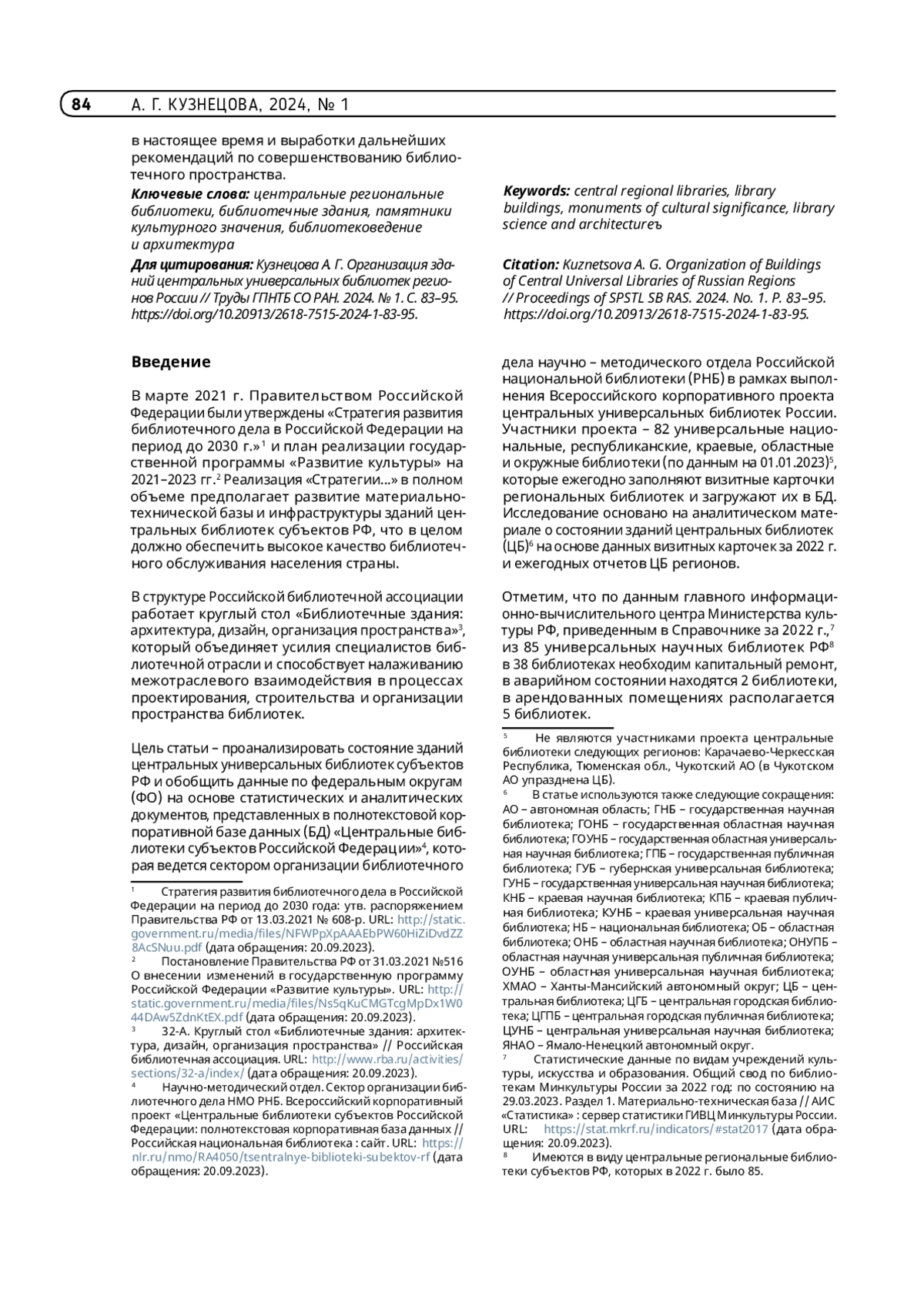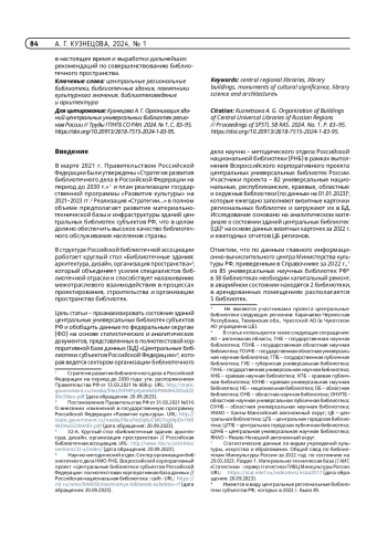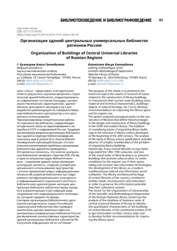 Цель статьи – представить в историческом аспекте результаты изучения вопросов о строительстве зданий библиотек, охарактеризовать их современное состояние (площадь, материально-технические характеристики, здания – объекты культурного наследия и пр.) для выработки рекомендаций по совершенствованию библиотечного пространства и его органичного использования. Проанализированы концептуальные работы по строительству библиотек, определяющие исторические этапы их проектирования и постройки в СССР и современной России. Традиция рассмотрения вопросов организации библиотечных зданий в структуре библиотековедения сложилась еще в начале XX в. Анализ библиотековедческих публикаций показал, что комплексное рассмотрение проблемы организации библиотечных зданий не проводилось. Исторически сложилось, что многие центральные библиотеки занимают строения XVIII–XIX вв., и одна из актуальных задач библиотечного дела – сохранение зданий, представляющих культурную ценность, создание условий для органичного использования пространства с учетом применения новых информационных технологий, развития библиотеки как современного полифункционального культурного и информационного социального института. Библиотечное архитектурное наследие центральных библиотек субъектов страны нуждается в реконструкции и реставрации ради сохранения того информационного потенциала, который содержат их фонды. Сектором организации библиотечного дела научно-методического отдела Российской национальной библиотеки был проведен анализ базы данных визитных карточек центральных универсальных библиотек России для выявления количественных характеристик зданий центральных библиотек субъектов РФ, получения информации об их состоянии в настоящее время и выработки дальнейших рекомендаций по совершенствованию библиотечного пространства.