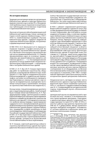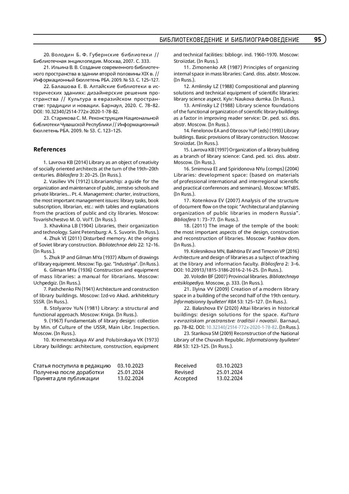 1. Лаврова К. Б. Библиотека как объект творчества социально ориентированных архитекторов рубежа XIX-XX вв. // Библиосфера. 2014. № 3. С. 20-25.