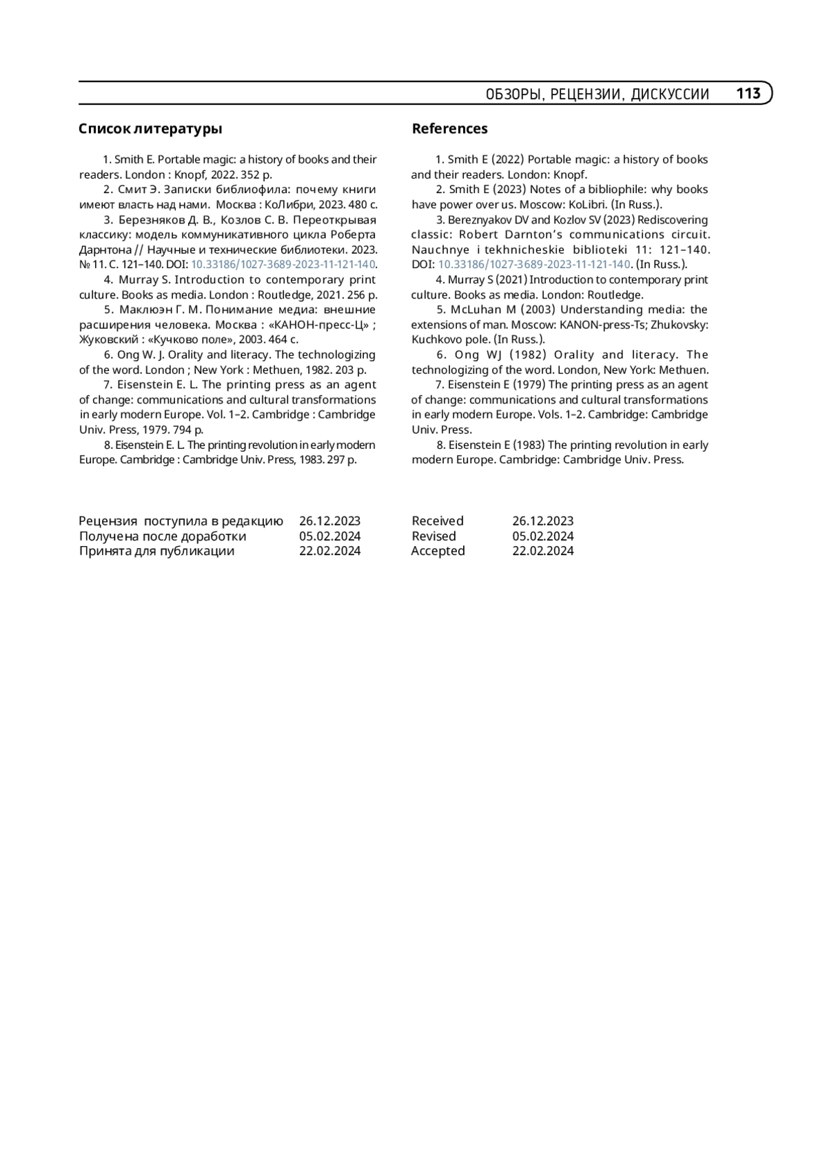 3. Березняков Д. В., Козлов С. В. Переоткрывая классику: модель коммуникативного цикла Роберта Дарнтона // Научные и технические библиотеки. 2023. № 11. С. 121-140. https://doi.org/10.33186/1027-3689-2023-11-121-140.