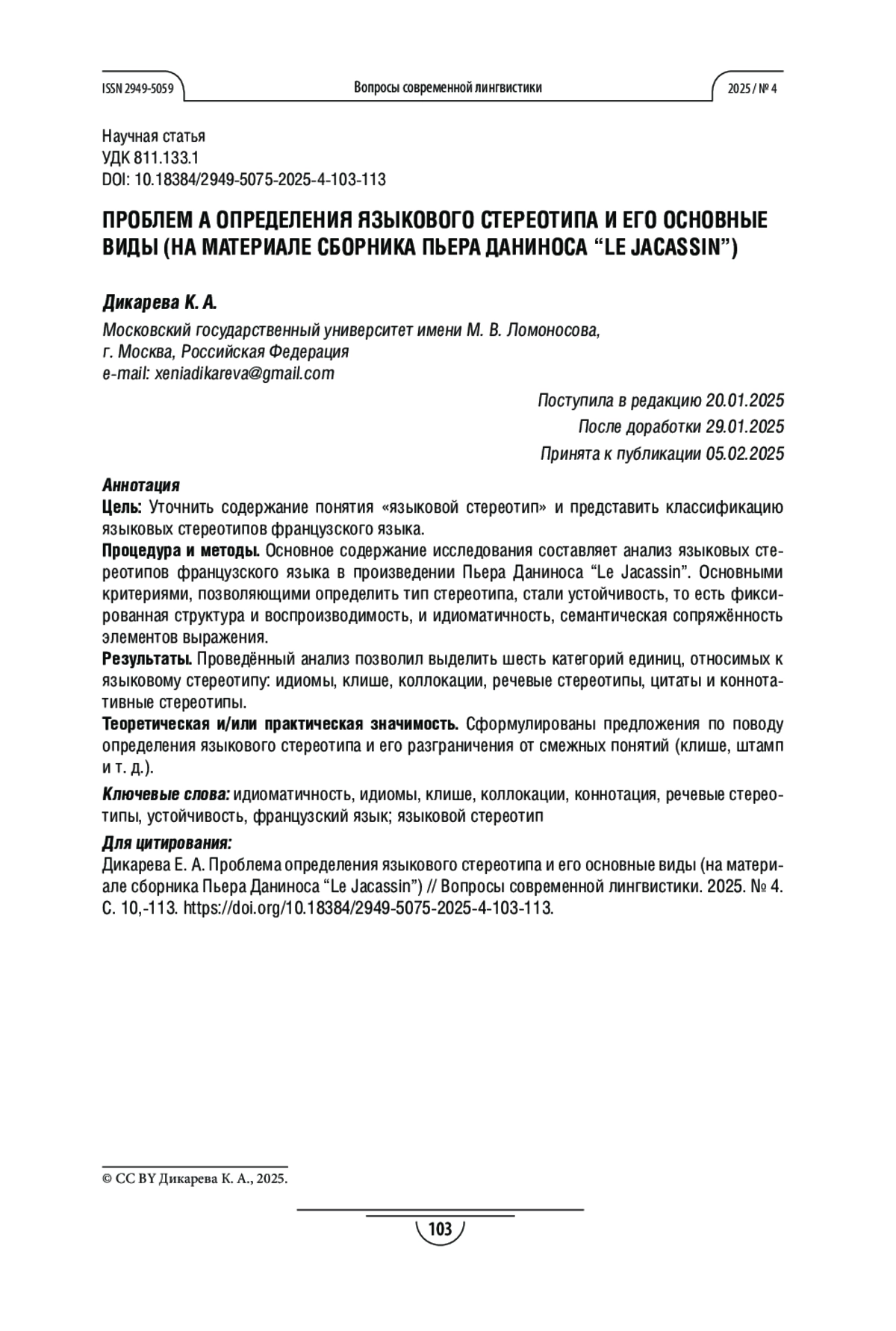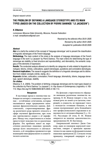 Процедура и методы. Основное содержание исследования составляет анализ языковых стереотипов французского языка в произведении Пьера Даниноса «Le Jacassin». Основными критериями, позволяющими определить тип стереотипа, стали устойчивость, то есть фиксированная структура и воспроизводимость, и идиоматичность, семантическая сопряженность элементов выражения.