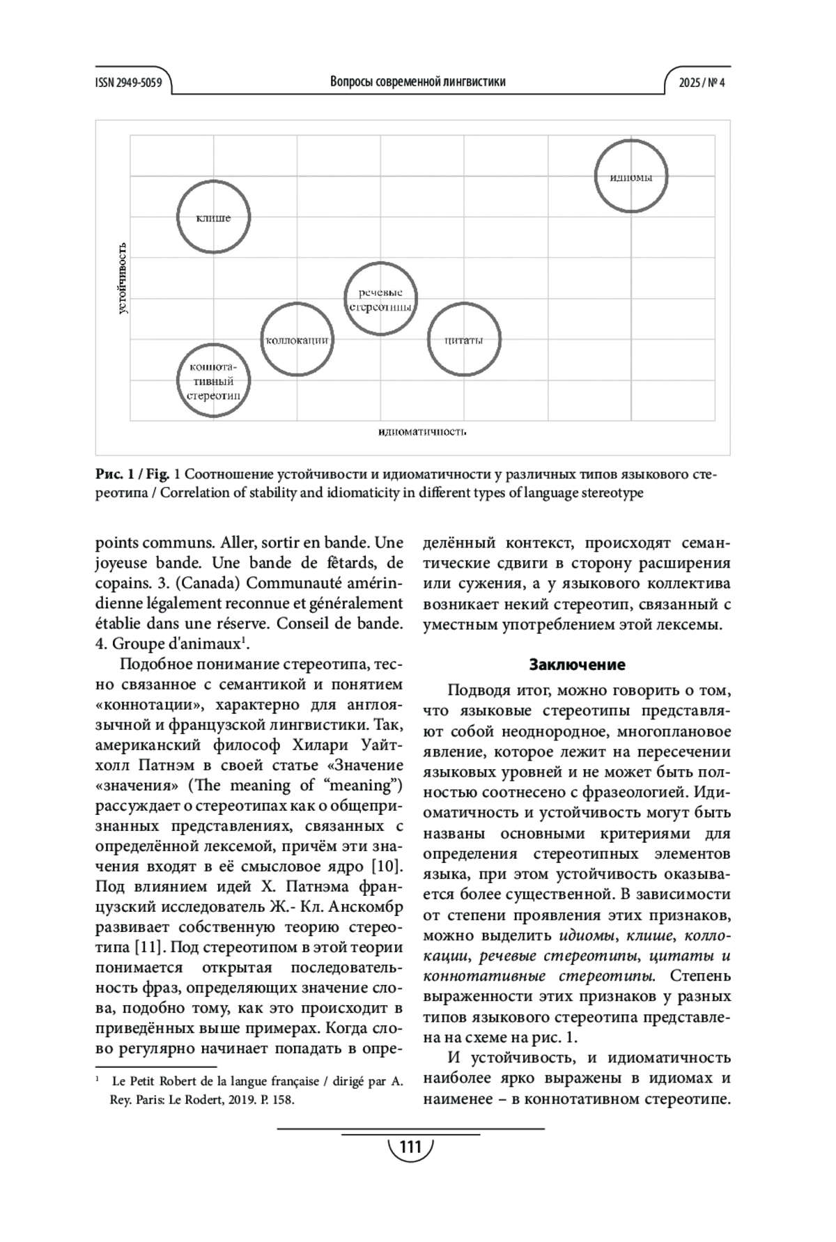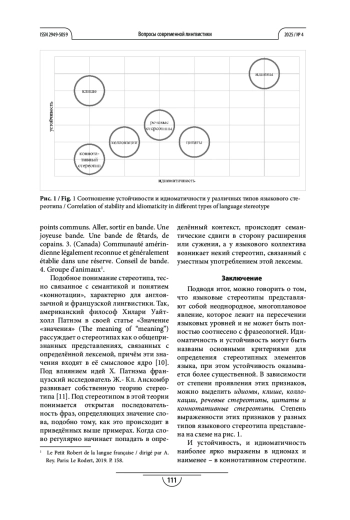 Результаты. Проведенный анализ позволил выделить шесть категорий единиц, относимых к языковому стереотипу: идиомы, клише, коллокации, речевые стереотипы, цитаты и коннотативные стереотипы.