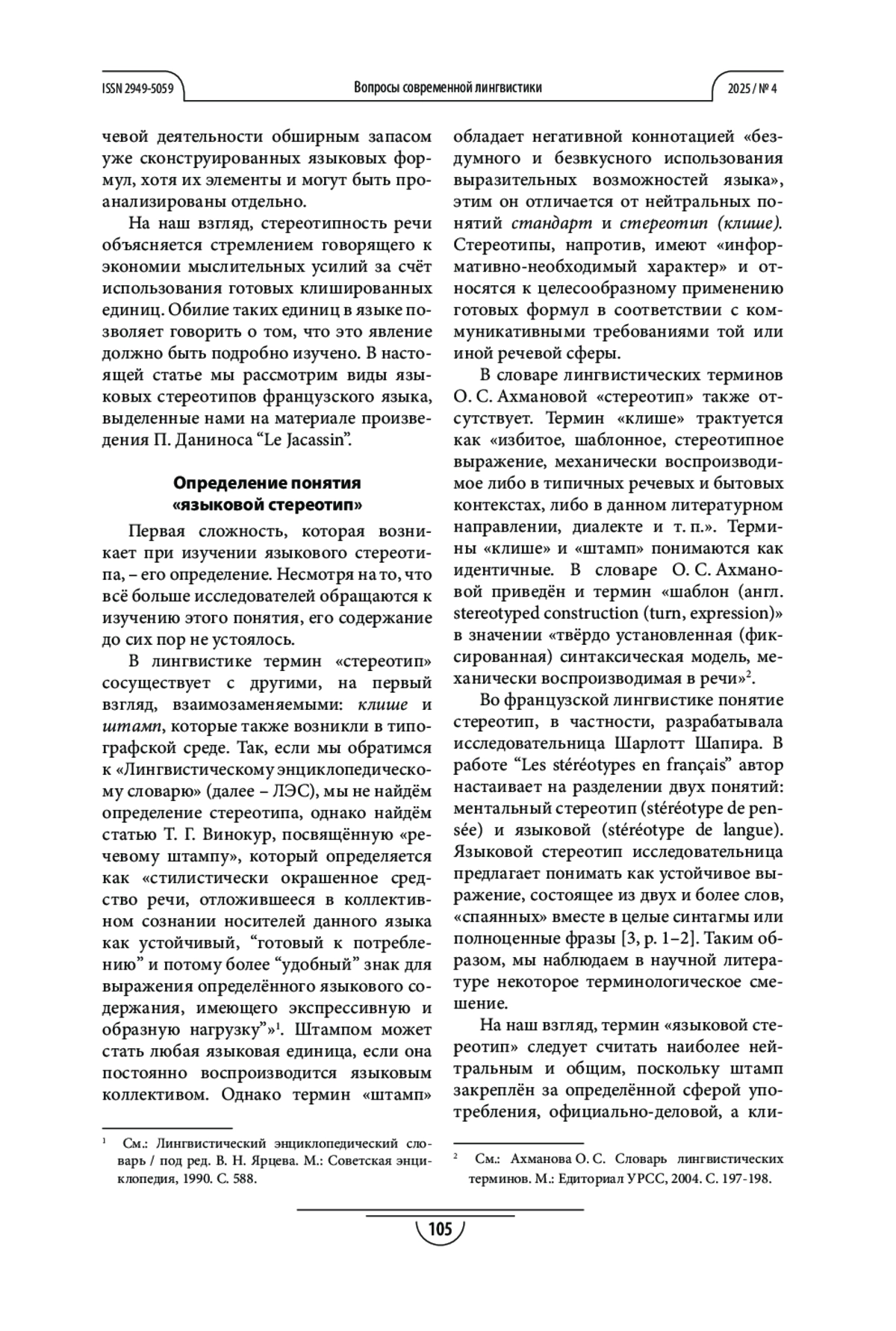 Теоретическая и/или практическая значимость. Сформулированы предложения по поводу определения языкового стереотипа и его разграничения от смежных понятий (клише, штамп и т. д.).
