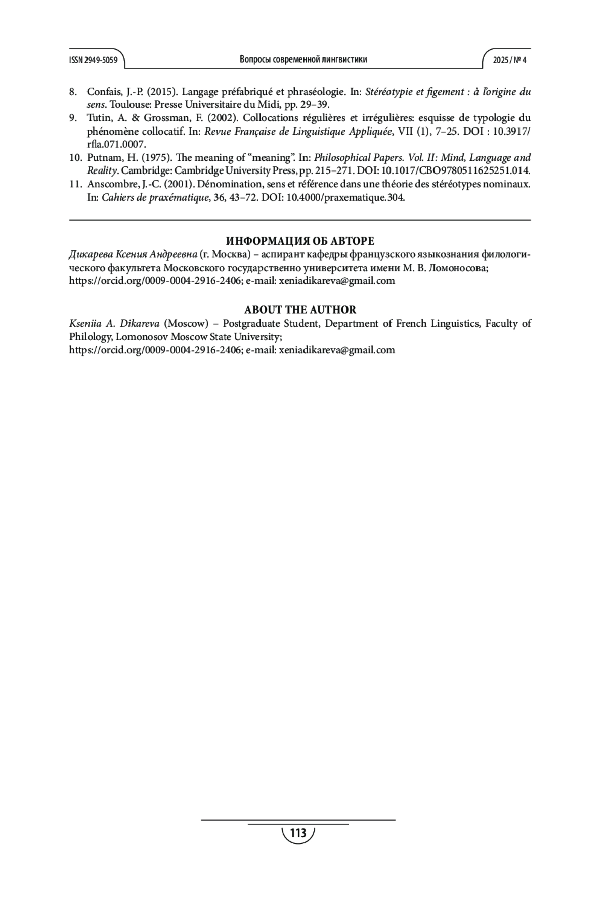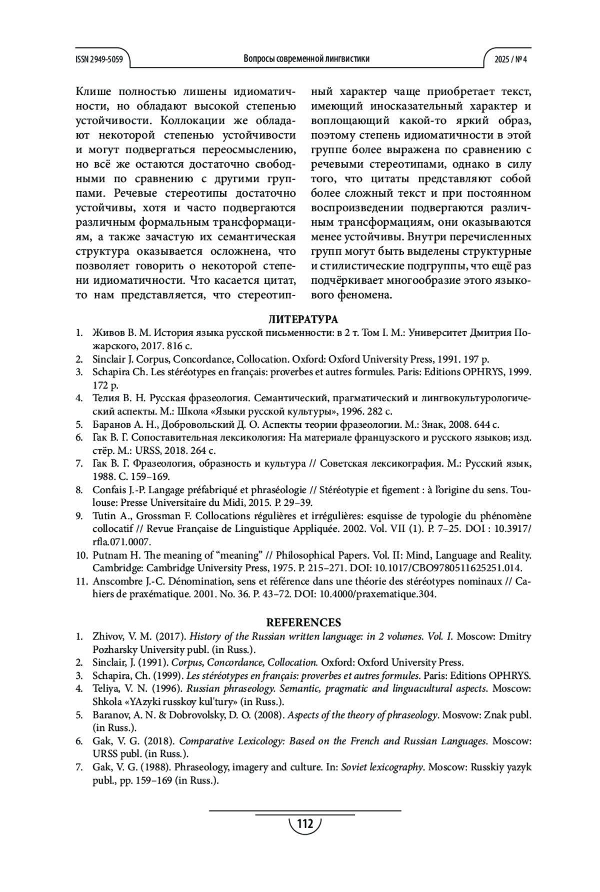 9. Tutin A., Grossman F. Collocations régulières et irrégulières: esquisse de typologie du phénomène collocatif // Revue Française de Linguistique Appliquée. 2002. Vol. VII (1). P. 7-25. DOI: 10.3917/rfla.071.0007