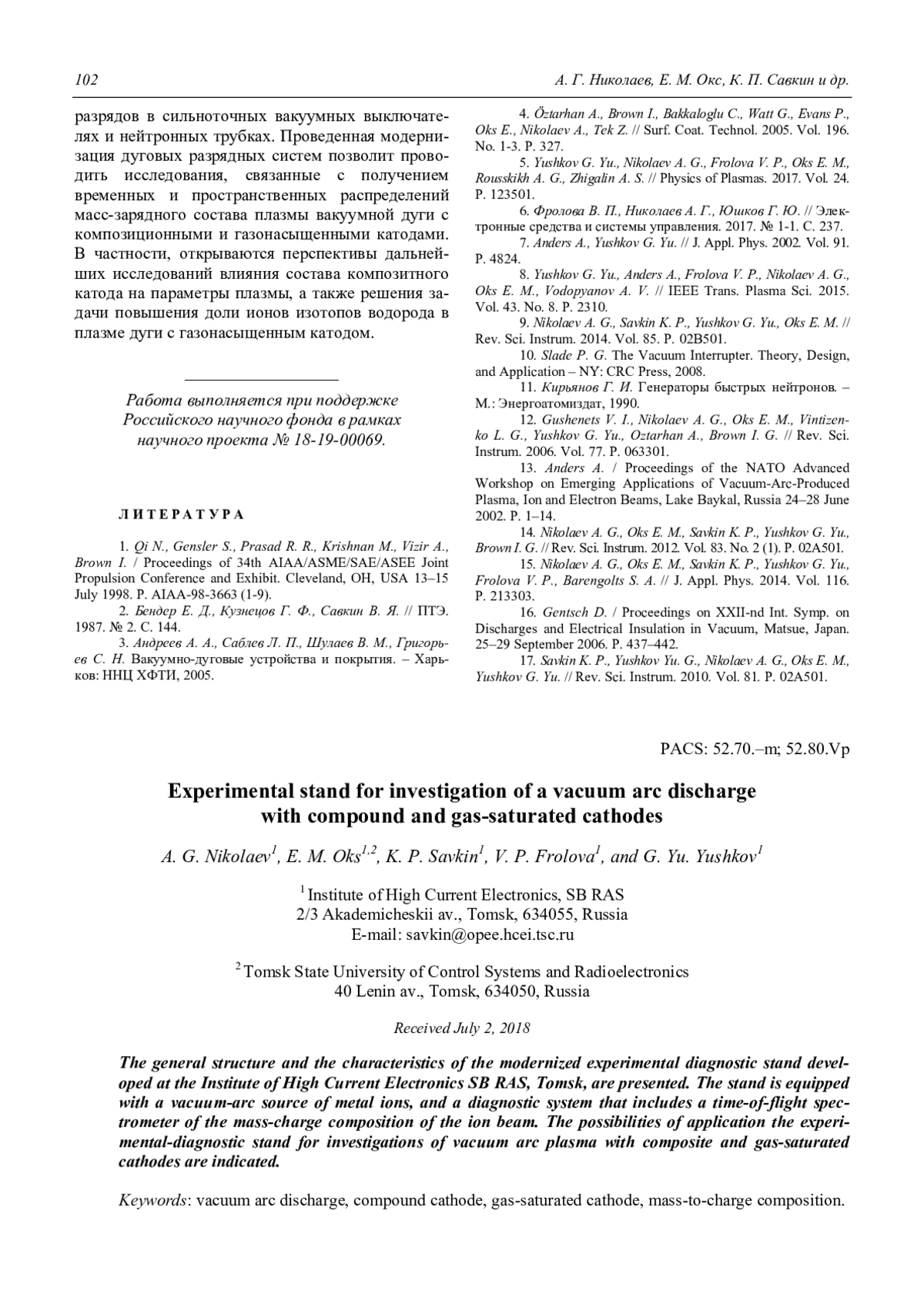 5. Yushkov G. Yu., Nikolaev A. G., Frolova V. P., Oks E. M., Rousskikh A. G., Zhigalin A. S. // Physics of Plasmas. 2017. Vol. 24. P. 123501.
