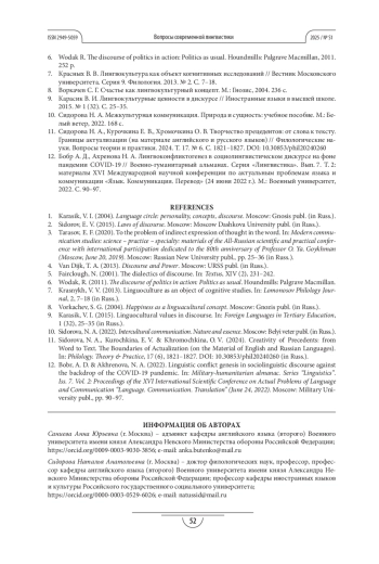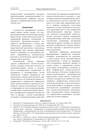 Результаты. На основе изучения феномена конфликтного военно-политического дискурса в коммуникативном пространстве различных лингвокультур выявлен интегративный элемент в развитии речевых и неречевых действий участников-оппонентов, которым выступают коммуникативный потенциал реализации противоположных лингвокультур при актуализации когнитивных стратегий конструирования политического дискурса. В процессе исследования установлено, что в качестве характерных особенностей конфликтных лингвокультур в роли средств коммуникативной репрезентации выступают прагматические показатели коммуникативной активности, основанные на противоположных культурных и ценностных предпочтениях. Конфликт интерпретируется как коммуникативное явление, сформированное в рамках социовербального сопряжения коммуникативных деятельностей, обусловленного значительным различием лингвокультур, культурных картин мира и ценностей участников дискурса.