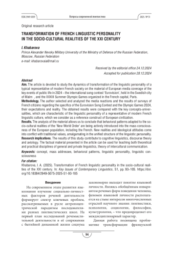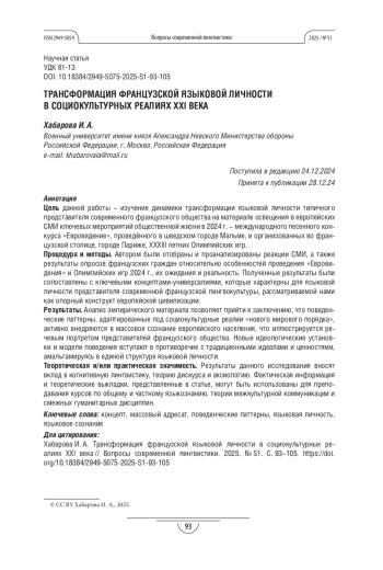 Статья: ТРАНСФОРМАЦИЯ ФРАНЦУЗСКОЙ ЯЗЫКОВОЙ ЛИЧНОСТИ В СОЦИОКУЛЬТУРНЫХ РЕАЛИЯХ XXI ВЕКА (2025)