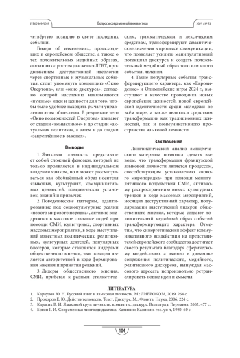 Результаты. Анализ эмпирического материала позволяет прийти к заключению, что поведенческие паттерны, адаптированные под социокультурные реалии «нового мирового порядка», активно внедряются в массовое сознание европейского населения, что иллюстрируется речевым портретом представителей французского общества. Новые идеологические установки и модели поведения вступают в противоречие с традиционными идеалами и ценностями, амальгамируясь в единой структуре языковой личности.