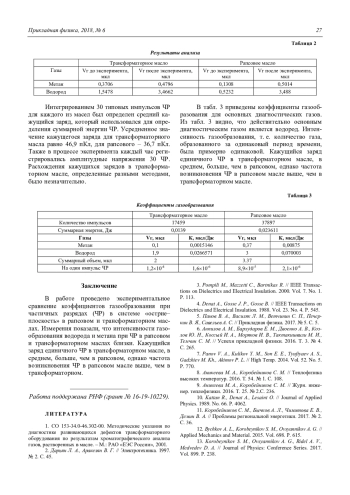 Измеренные интенсивности газообразования при частичных разрядах в рапсовом и трансформаторном маслах оказались близкими по значению. Кажущийся заряд единичного частичного разряда в трансформаторном масле, в среднем, выше, чем в рапсовом. Частота возникновения частичного разряда в рапсовом масле выше, чем в трансформаторном.