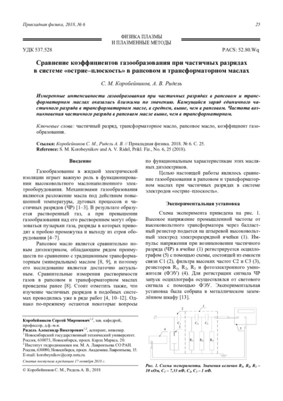 Коробейников С. М., Ридель А. В. Сравнение коэффициентов газообразования при частичных разрядах в системе острие – плоскость в рапсовом и трансформаторном маслах 25