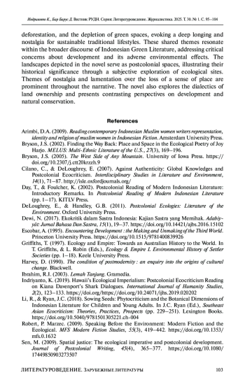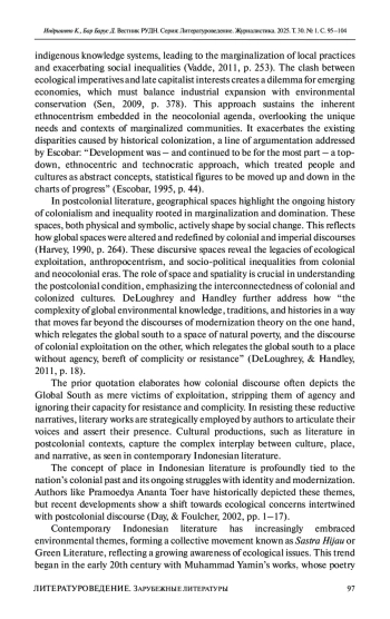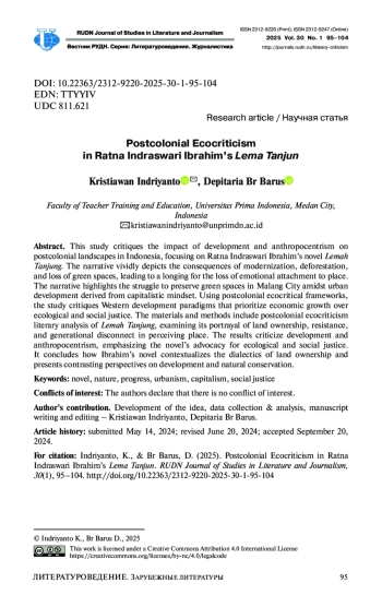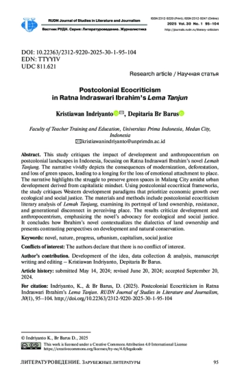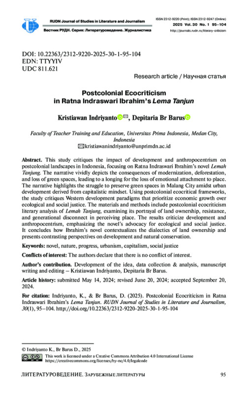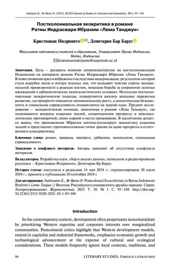 Цель – раскрыть влияние антропоцентризма на постколониальную Индонезию на материале романа Ратны Индрасвари Ибрахим «Лема Танджун». В повествовании ярко изображены последствия модернизации, результатом которой стали вырубки лесов и потери зеленых зон, что вызывает чувство утраты эмоциональной привязанности к родным местам, показана борьба за сохранение зеленых насаждений в урбанистических капиталистических условиях. Используя постколониальные экокритические подходы, подвергаются анализу западные парадигмы развития, где приоритет отводится экономическому росту, а экологическая безопасность и социальная справедливость отодвигаются на задний план.