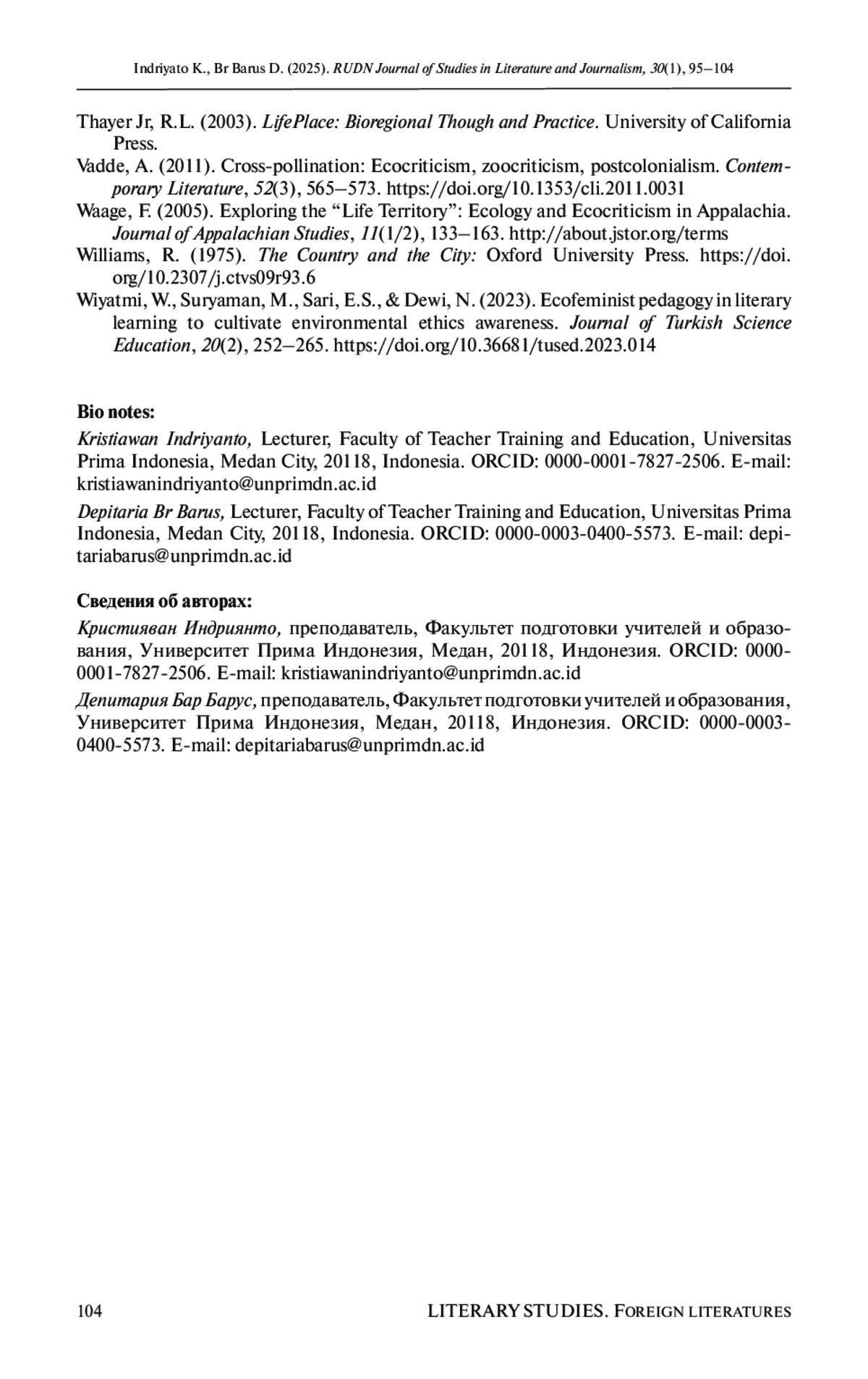 20. Wiyatmi, W., Suryaman, M., Sari, E.S., & Dewi, N. (2023). Ecofeminist pedagogy in literary learning to cultivate environmental ethics awareness. Journal of Turkish Science Education, 20(2), 252-265. DOI: 10.36681/tused.2023.014 EDN: EUTIUX