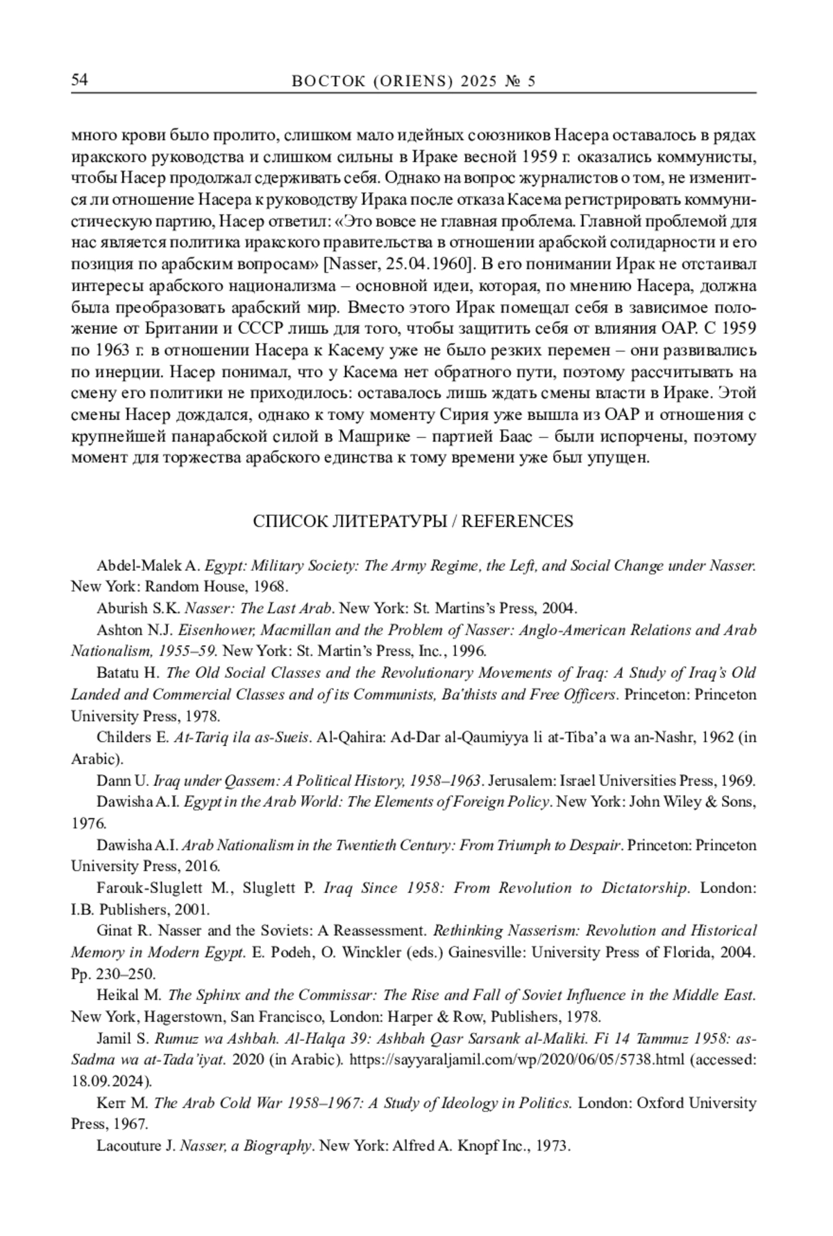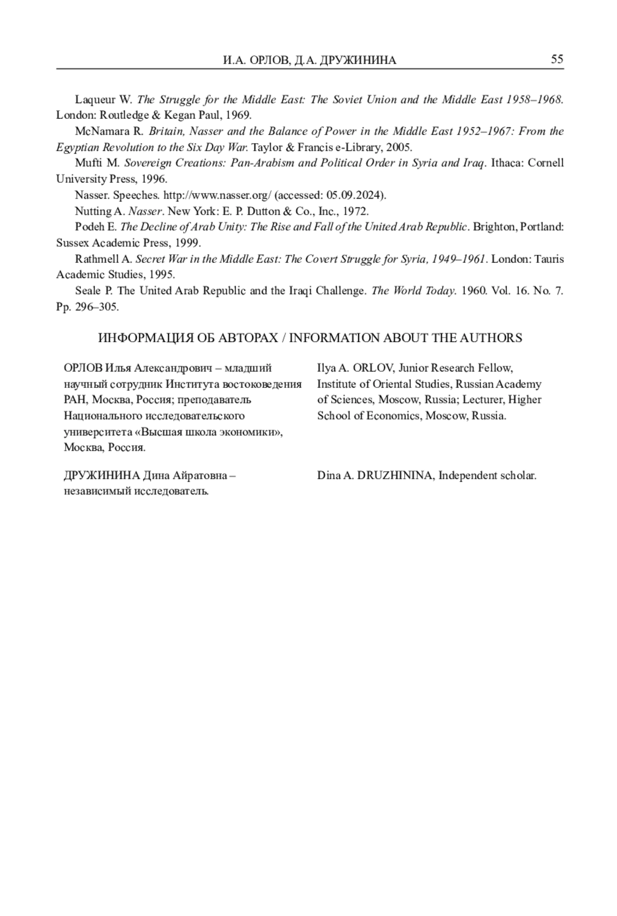 10. Ginat R. Nasser and the Soviets: A Reassessment. In Rethinking Nasserism: Revolution and Historical Memory in Modern Egypt. Ed. By Podeh E. and Winckler O. Gainesville: University Press of Florida, 2004. Pp. 230-250.