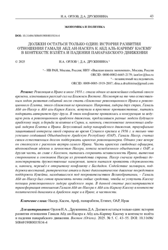 Середина XX века была периодом надежд на арабское единство, которому так и не было суждено осуществиться. Наивысшего подъёма панарабское движение достигло в момент объединения Египта и Сирии в 1958 г. Однако уже меньше, чем через полгода, послереволюционная политическая динамика в Ираке показала, что арабскому единству препятствуют не только внешние, но и внутренние противоречия. Чтобы подробнее рассмотреть один из ключевых сюжетов в истории панарабского движения, а именно – конфликт между режимом ОАР и революционным иракским режимом, в данной статье с помощью выстраивания хронологии ключевых событий того времени, а также выступлений и интервью Гамаля Абд ан-Насера проводится анализ трансформации отношения Насера к лидеру Иракской республики Абд аль-Кариму Касему.