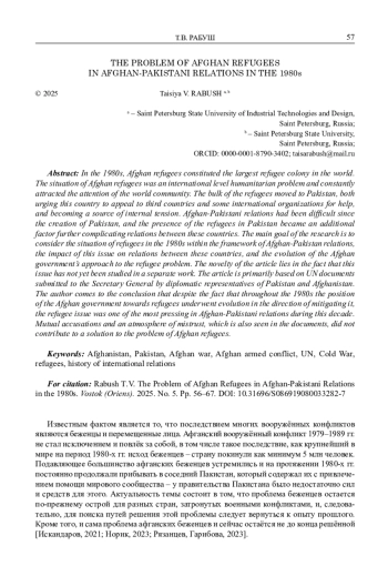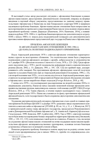 В 1980-е гг. афганские беженцы представляли собой самую крупную колонию беженцев в мире. Ситуация, сложившаяся вокруг афганских беженцев, представляла собой гуманитарную проблему международного уровня и постоянно привлекала внимание мирового сообщества, в том числе и ООН. Основная часть беженцев переместилась в Пакистан, что было для Пакистана как поводом для регулярных обращений к третьим странам и некоторым международным организациям за помощью, так и источником внутренней напряжённости. Афгано-пакистанские отношения были непростыми с момента создания независимого государства Пакистан, а после Апрельской революции 1978 г. и последующего ввода на территорию Афганистана советских войск, когда Пакистан по факту стал базой для пребывания руководства афганского антиправительственного движения и подготовки боевых единиц для него, эти отношения ухудшились ещё больше. Пребывание подавляющего большинства афганских беженцев на территории Пакистана стало дополнительным фактором, ещё больше осложняющим отношения этих стран. Основная цель – рассмотреть вопрос о положении беженцев на протяжении 1980-х гг. в рамках афгано-пакистанских отношений, влияние этого вопроса на отношения двух стран и эволюцию подхода афганского правительства к проблеме беженцев. Новизна исследования состоит в том, что этот вопрос ещё не рассматривался в отдельной работе. Базой для статьи стали документы ООН, направляемые на имя Генерального секретаря дипломатическими представителями Пакистана и Афганистана. Автор приходит к выводу, что, невзирая на то, что позиция афганского правительства в отношении беженцев претерпела эволюцию на протяжении 1980-х гг. в направлении смягчения, вопрос о положении беженцев в это десятилетие был одним из наиболее значимых в афгано-пакистанских отношениях. Взаимные обвинения и атмосфера недоверия, что можно увидеть в том числе и в документах, не способствовали решению проблемы беженцев, которая остаётся актуальной и сейчас.