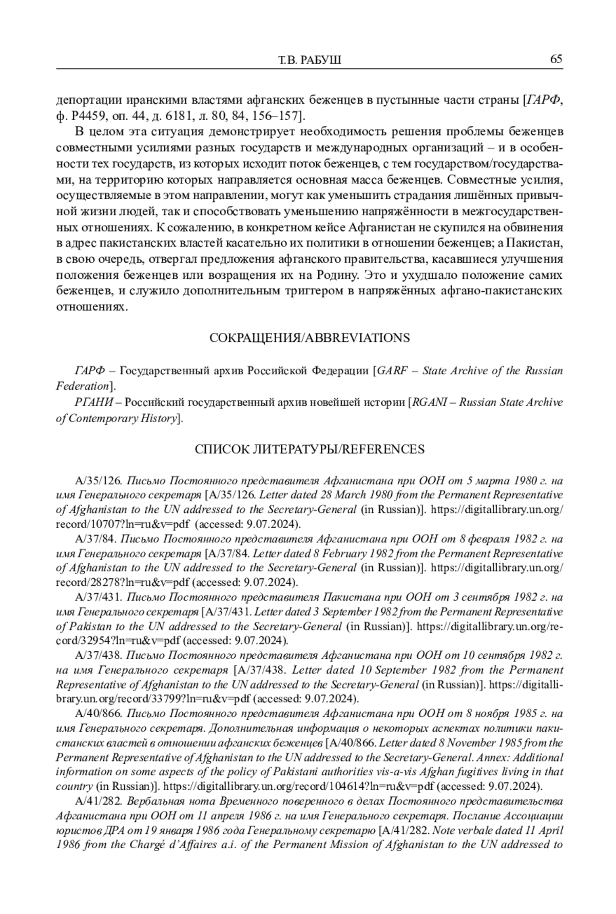 5. А/40/866. Письмо Постоянного представителя Афганистана при ООН от 8 ноября 1985 г. на имя Генерального секретаря. Дополнительная информация о некоторых аспектах политики пакистанских властей в отношении афганских беженцев. https://digitallibrary.un.org/record/104614?ln=ru&v=pdf (accessed: 9.07.2024).