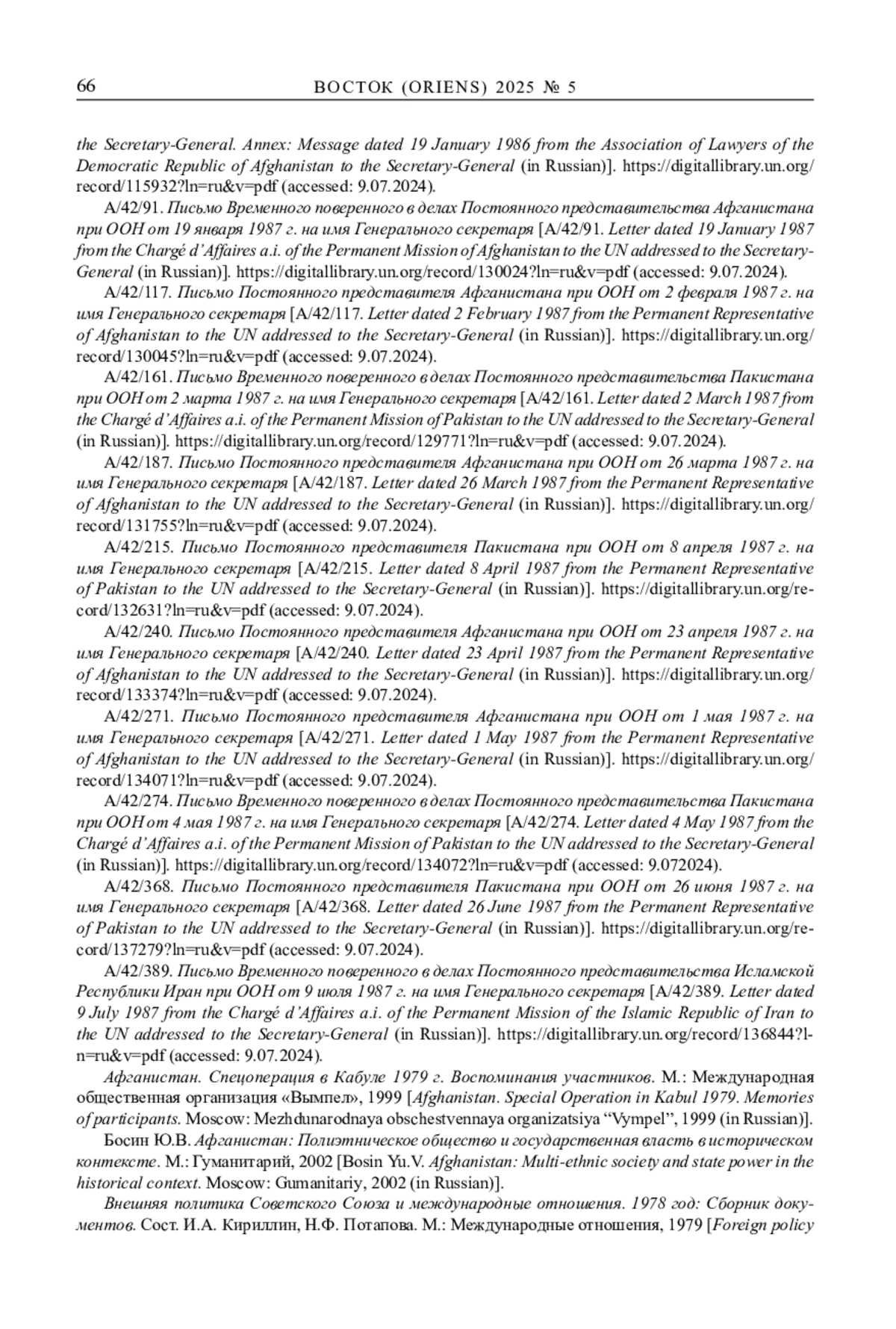 7. А/42/91. Письмо Временного поверенного в делах Постоянного представительства Афганистана при ООН от 19 января 1987 г. на имя Генерального секретаря. https://digitallibrary.un.org/record/130024?ln=ru&v=pdf (accessed: 9.07.2024).