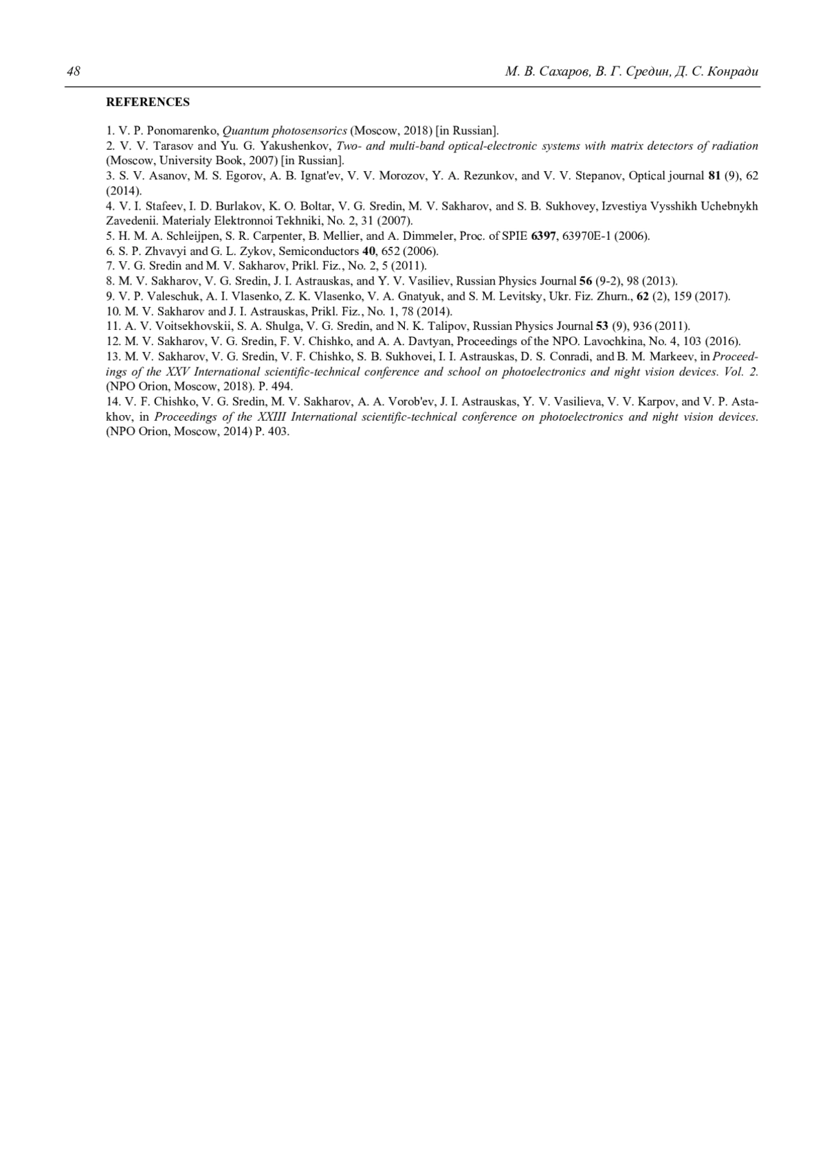 13. M. V. Sakharov, V. G. Sredin, V. F. Chishko, S. B. Sukhovei, I. I. Astrauskas, D. S. Conradi, and B. M. Markeev, in Proceedings of the XXV International scientific-technical conference and school on photoelectronics and night vision devices. Vol. 2. (NPO Orion, Moscow, 2018). P. 494.