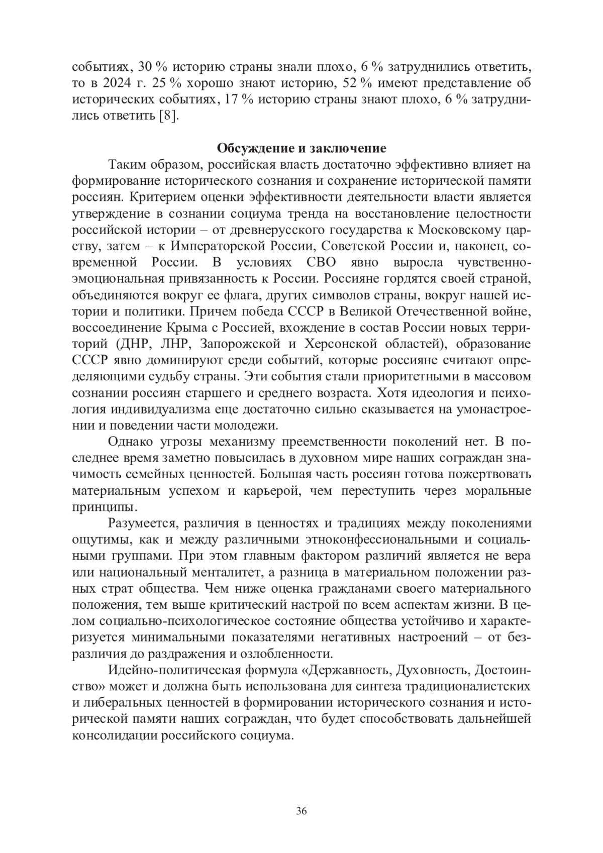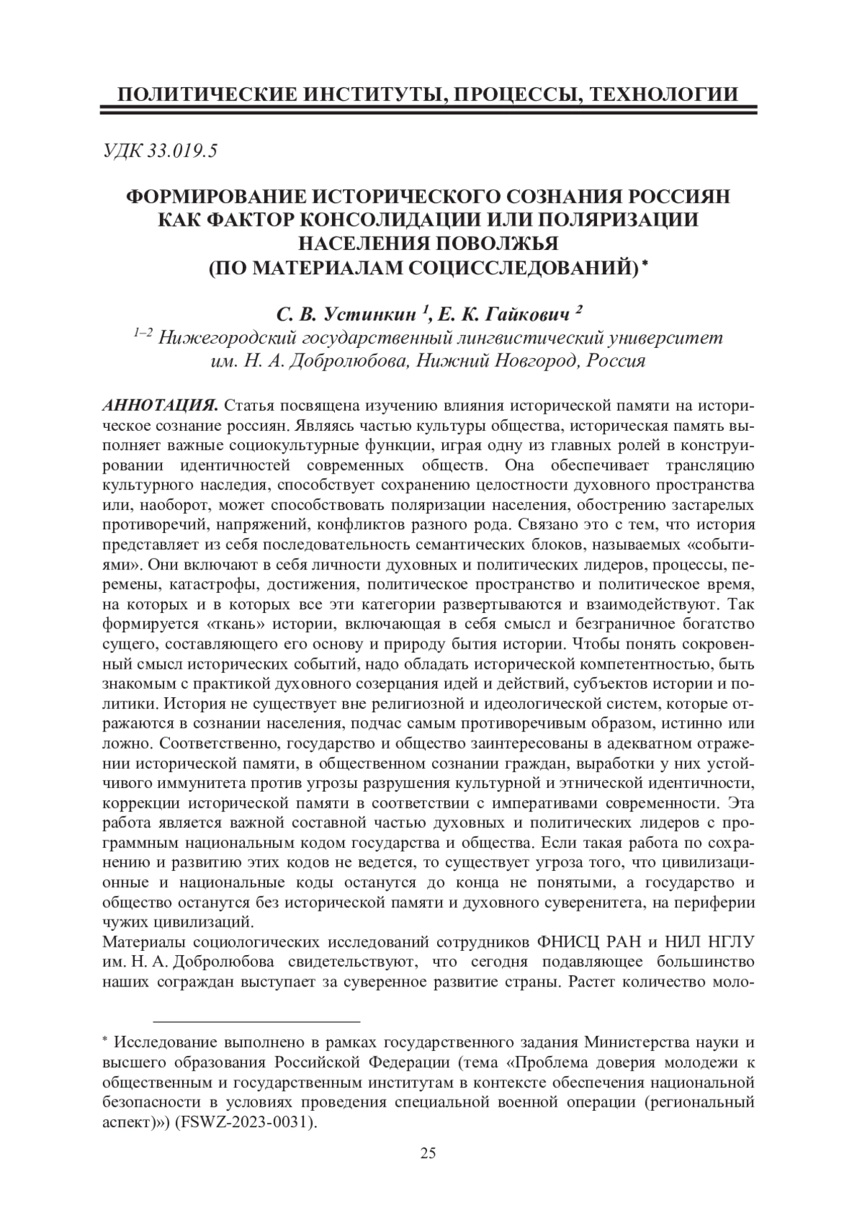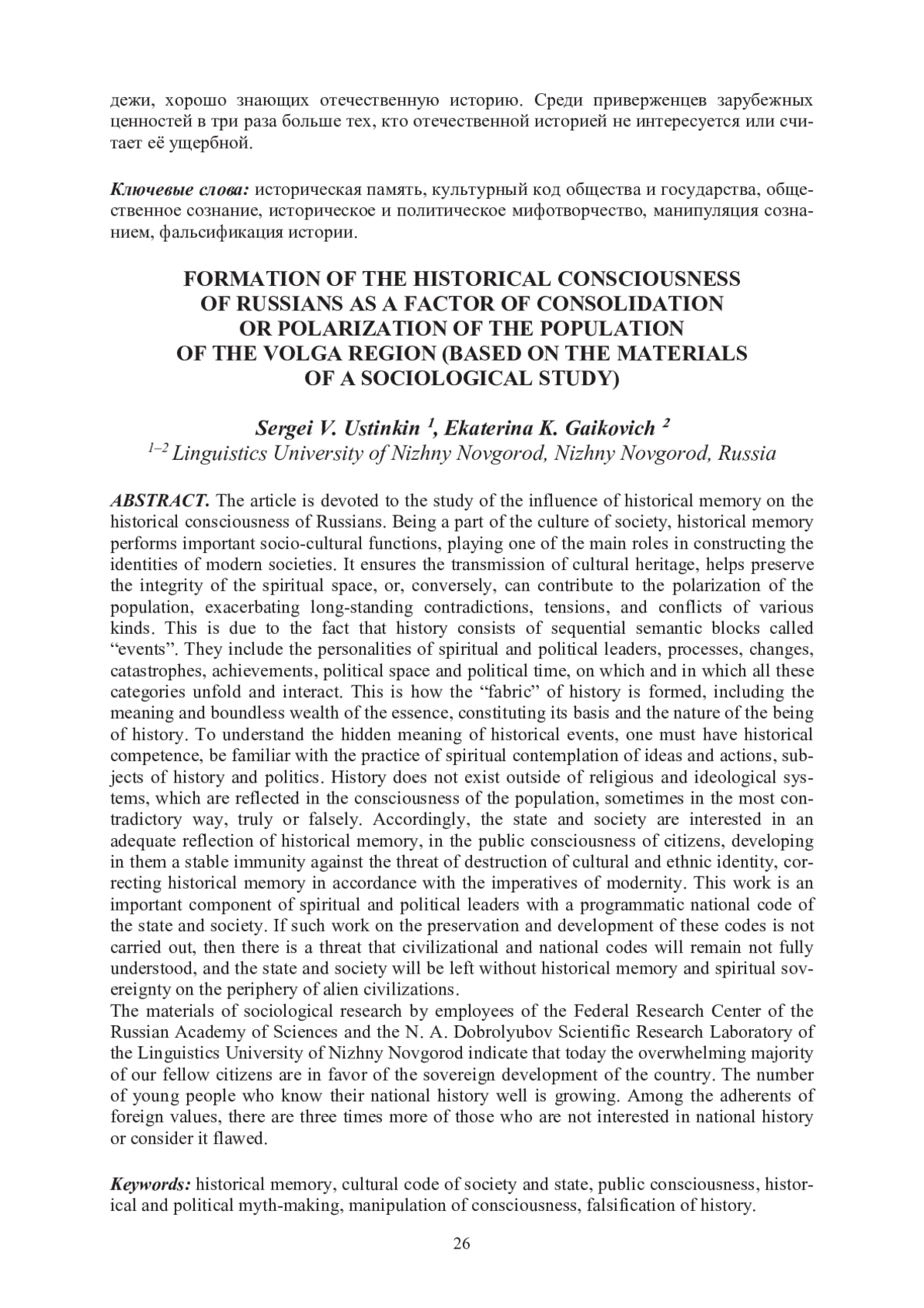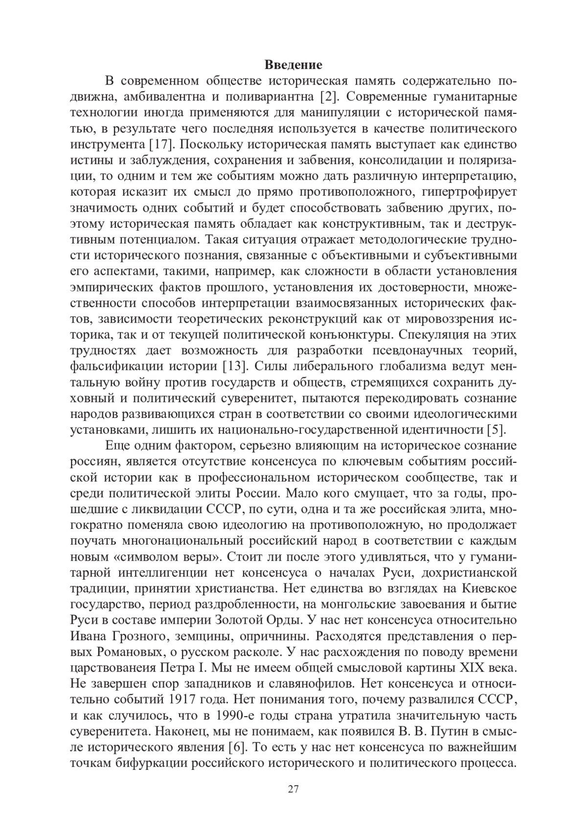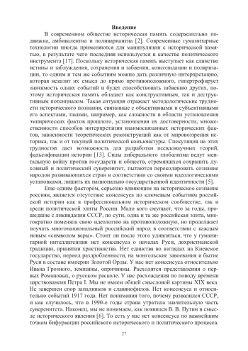 Статья посвящена изучению влияния исторической памяти на историческое сознание россиян. Являясь частью культуры общества, историческая память выполняет важные социокультурные функции, играя одну из главных ролей в конструировании идентичностей современных обществ. Она обеспечивает трансляцию культурного наследия, способствует сохранению целостности духовного пространства или, наоборот, может способствовать поляризации населения, обострению застарелых противоречий, напряжений, конфликтов разного рода. Связано это с тем, что история представляет из себя последовательность семантических блоков, называемых «событиями». Они включают в себя личности духовных и политических лидеров, процессы, перемены, катастрофы, достижения, политическое пространство и политическое время, на которых и в которых все эти категории развертываются и взаимодействуют. Так формируется «ткань» истории, включающая в себя смысл и безграничное богатство сущего, составляющего его основу и природу бытия истории. Чтобы понять сокровенный смысл исторических событий, надо обладать исторической компетентностью, быть знакомым с практикой духовного созерцания идей и действий, субъектов истории и политики. История не существует вне религиозной и идеологической систем, которые отражаются в сознании населения, подчас самым противоречивым образом, истинно или ложно. Соответственно, государство и общество заинтересованы в адекватном отражении исторической памяти, в общественном сознании граждан, выработки у них устойчивого иммунитета против угрозы разрушения культурной и этнической идентичности, коррекции исторической памяти в соответствии с императивами современности. Эта работа является важной составной частью духовных и политических лидеров с программным национальным кодом государства и общества. Если такая работа по сохранению и развитию этих кодов не ведется, то существует угроза того, что цивилизационные и национальные коды останутся до конца не понятыми, а государство и общество останутся без исторической памяти и духовного суверенитета, на периферии чужих цивилизаций. Материалы социологических исследований сотрудников ФНИСЦ РАН и НИЛ НГЛУ им. Н. А. Добролюбова свидетельствуют, что сегодня подавляющее большинство наших сограждан выступает за суверенное развитие страны. Растет количество молодежи, хорошо знающих отечественную историю. Среди приверженцев зарубежных ценностей в три раза больше тех, кто отечественной историей не интересуется или считает её ущербной.