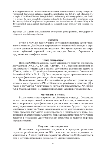 В статье рассматривается проблема кардинального разворота ООН и государств Запада в вопросах представлений о будущем устойчивого развития человечества. Разнонаправленность представлений о путях устойчивого развития является сегодня предметом дискуссии и противоречий, камнем преткновения для выработки единого понимания и международных норм в отношении будущего мирового развития. Наблюдается разлад международной системы согласования основополагающих документов в сфере мирового развития, размежевание государств в их видении перспектив будущего международного сотрудничества, критикуется давление со стороны рекомендательных органов ООН в отношении суверенных государств по вопросам ценностей, прав и свобод человека. Так, кардинальное расхождение приоритетов развития наблюдается в подходах ООН и России по вопросам ликвидации нищеты, голода, экологической деградации, уменьшения неравенства, репродукции и рождаемости, образования. Например, если ООН связывает глобальные риски для человечества с перенаселением, а рождаемость рассматривается как главное препятствие на пути достижения устойчивости, в России выводы о перенаселенности планеты считаются преждевременными, а главным фактором устойчивости признается развитие человеческого капитала, дезурбанизация, повышение энергоэффективности и ресурсосбережения.