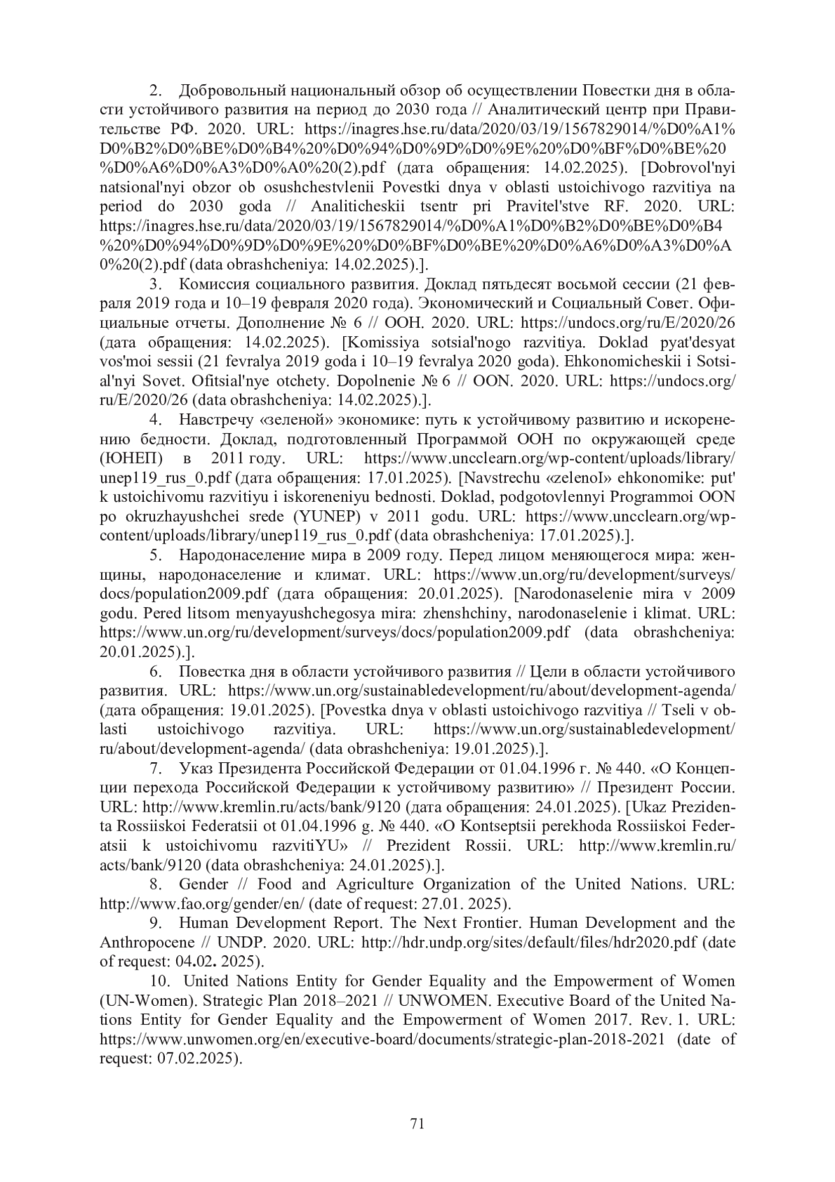 2. Добровольный национальный обзор об осуществлении Повестки дня в области устойчивого развития на период до 2030 года // Аналитический центр при Правительстве РФ. 2020. URL: https://inagres.hse.ru/data/2020/03/19/1567829014/%D0%A1%D0%B2%D0%BE%D0%B4%20%D0%94%D0%9D%D0%9E%20%D0%BF%D0%BE%20%D0%A6%D0%A3%D0%A0%20(2).pdf (дата обращения: 14.02.2025).