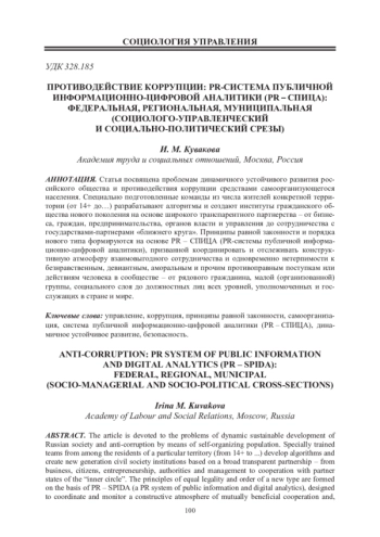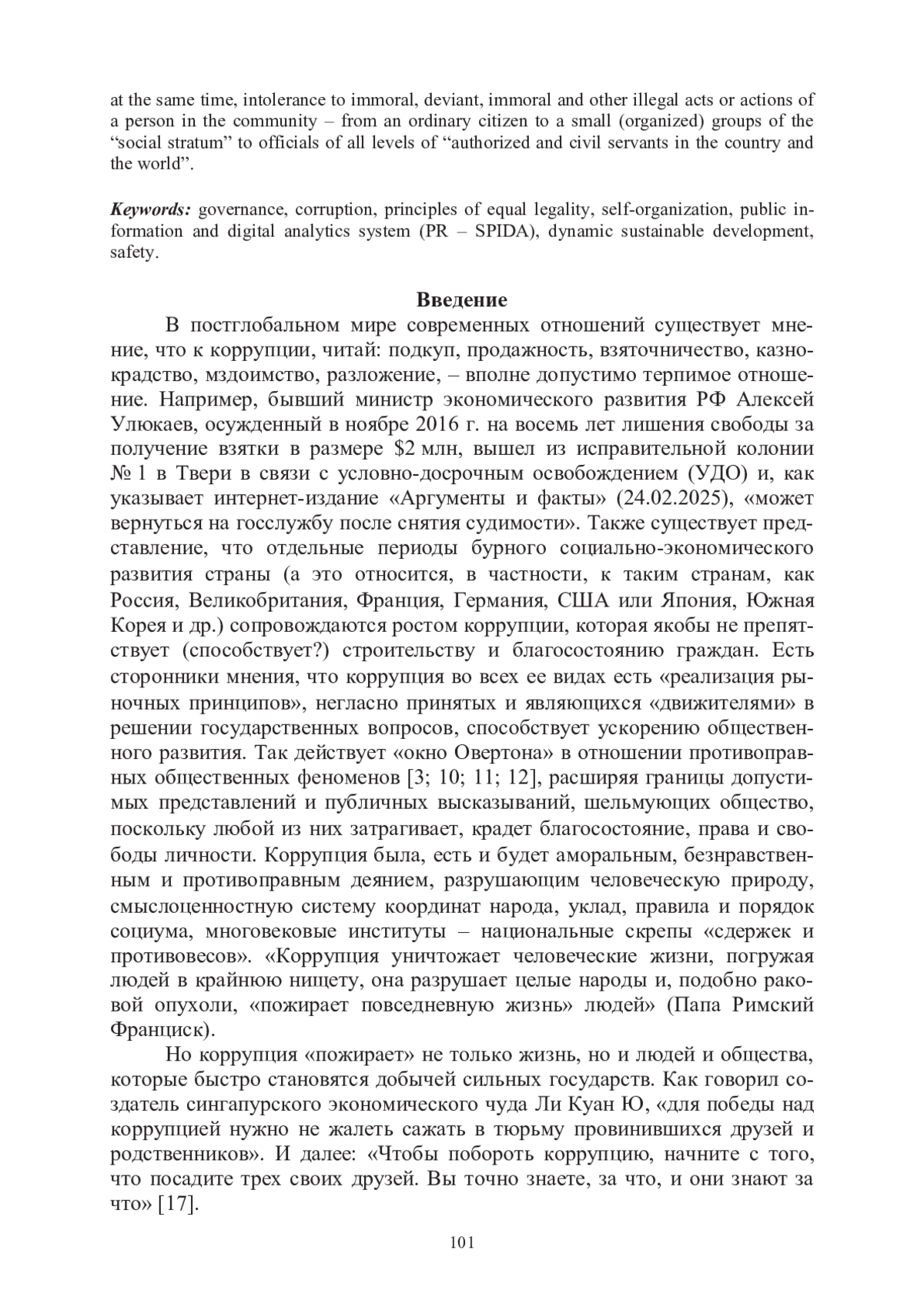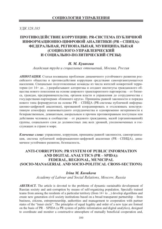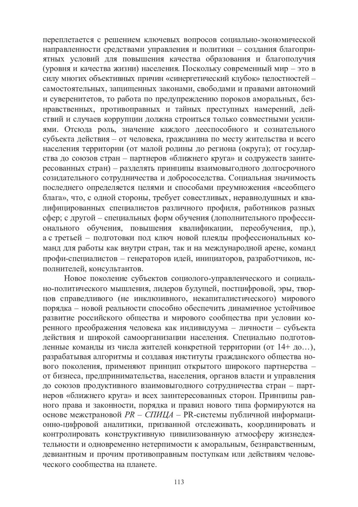 Статья посвящена проблемам динамичного устойчивого развития российского общества и противодействия коррупции средствами самоорганизующегося населения. Специально подготовленные команды из числа жителей конкретной территории (от 14+ до…) разрабатывают алгоритмы и создают институты гражданского общества нового поколения на основе широкого транспарентного партнерства - от бизнеса, граждан, предпринимательства, органов власти и управления до сотрудничества с государствами-партнерами «ближнего круга». Принципы равной законности и порядка нового типа формируются на основе PR - СПИЦА (PR-системы публичной информационно-цифровой аналитики), призванной координировать и отслеживать конструктивную атмосферу взаимовыгодного сотрудничества и одновременно нетерпимости к безнравственным, девиантным, аморальным и прочим противоправным поступкам или действиям человека в сообществе - от рядового гражданина, малой (организованной) группы, социального слоя до должностных лиц всех уровней, уполномоченных и госслужащих в стране и мире.