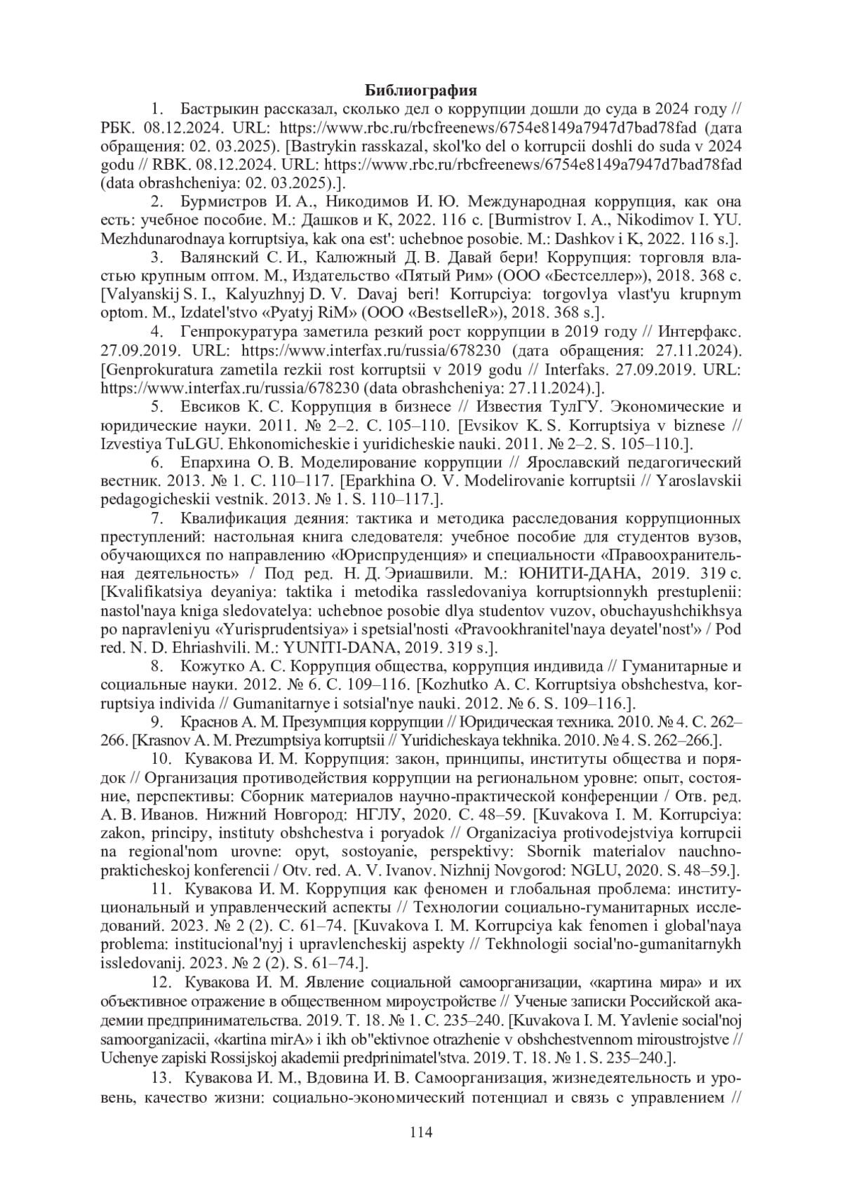 10. Кувакова И. М. Коррупция: закон, принципы, институты общества и порядок // Организация противодействия коррупции на региональном уровне: опыт, состояние, перспективы: Сборник материалов научно-практической конференции / Отв. ред. А. В. Иванов. Нижний Новгород: НГЛУ, 2020. С. 48-59. EDN: PNBXRX