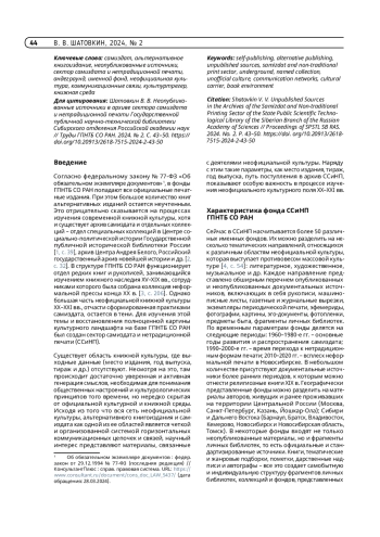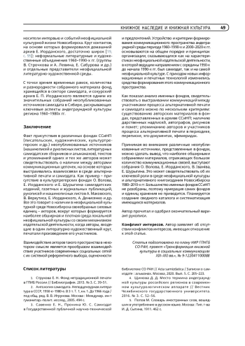 Цель статьи – представить структуру формирования общего архива сектора самиздата и нетрадиционной печати лаборатории книговедения ГПНТБ СО РАН на примере основных единиц хранения – именных фондов писателей, художников, культуртрегеров, музыкантов. В статье приведена классификация имеющихся в фондах сектора неопубликованных источников, проанализировано наличие авторских материалов, дарственных надписей, автографов, рисунков и помет, упоминание авторов и участников процесса альтернативной печати в периодике и переписке. Описаны имеющиеся в секторе источники самиздата и экземпляры нетрадиционной печати, раскрывается содержание тематических направлений. Охарактеризованы архивные единицы на примере образцов альтернативного книгоиздания, различных форм самиздата, эфемерид, эгодокументов, фрагментов личных библиотек, материалов периодической печати. Представлена классификация именных фондов по временной периодизации, тематическим и территориальным характеристикам. На примере личных собраний М. Батурина, И. Ахметьева, В. Iванiва, О. Волова, Е. Шурыгина, Е. Иорданского, А. Чеканова, а также различных неофициальных творческих сообществ и групп проводится анализ содержания представленных источников. Особое внимание уделяется формированию коммуникационных цепочек и связей между авторами в неформальной культурной среде, области самиздата и альтернативного книгоиздания 1960–2010-х гг., выясняются критерии выстраивания подобных взаимосвязей.