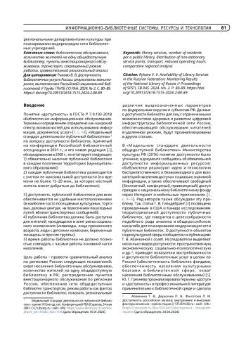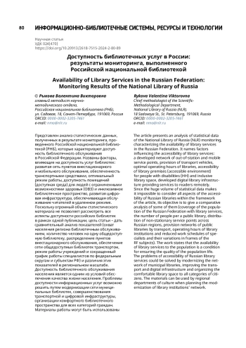 Представлен анализ статистических данных, полученных в результате мониторинга, проведенного Российской национальной библиотекой (РНБ), которые характеризуют доступность библиотечного обслуживания в Российской Федерации. Названы факторы, влияющие на доступность услуг библиотек: развитая сеть пунктов внестационарного и мобильного обслуживания, обеспеченность транспортными средствами, оптимальный режим работы, доступность помещений (доступная среда) для людей с ограниченными возможностями здоровья (ОВЗ) и инклюзивное библиотечное пространство, развитая цифровая инфраструктура, обеспечивающая обслуживание читателей в удаленном режиме. Поскольку огромный объем статистического материала не позволяет рассмотреть все аспекты доступности российских библиотек в рамках одной публикации, цель статьи – дать сравнительный анализ показателей (охват населения региона библиотечным обслуживанием, количество человек на одну общедоступную библиотеку, распределение пунктов внестационарного обслуживания, обеспечение сети общедоступных библиотек транспортом, режим работы учреждений и сокращенный график работы специалистов по федеральным округам и субъектам РФ) и различия этих показателей в региональном масштабе. Доступность библиотечного обслуживания населения является одним из условий обеспечения качества жизни населения. Проблемы доступности информационных услуг возможно решить путем модернизации сети муниципальных библиотек, совершенствования транспортной и цифровой инфраструктуры, организации комфортного библиотечного пространства для всех категорий граждан. Материалы работы могут быть использованы региональными департаментами культуры при планировании модернизации сети библиотечных учреждений.