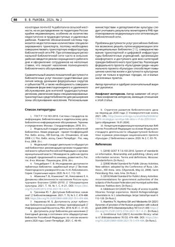 7. Аврамова М. Б. Доступность услуг публичных библиотек в условиях сетевых трансформаций // Информационный бюллетень РБА. 2018. № 81. С. 41-45.
