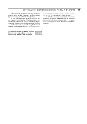6. Грехнева Ю. Г. Доступная библиотека: какая она? // Библиотековедение. 2021. Т. 70, № 5. С. 474-484. https://doi.org/10.25281/0869-608X-2021-70-5-474-484.