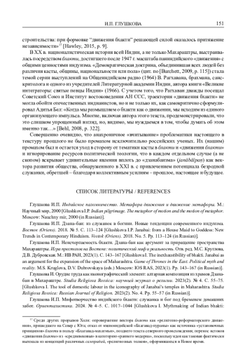 3. Глушкова И.П. Неисчерпаемость бхакти. Дзана-баи как аргумент за приращение пространства Махараштры. Игра престолов на Востоке: политический миф и реальность. Отв. ред. М.С. Круглова, Д.В. Дубровская. М.: ИВ РАН, 2023(1).