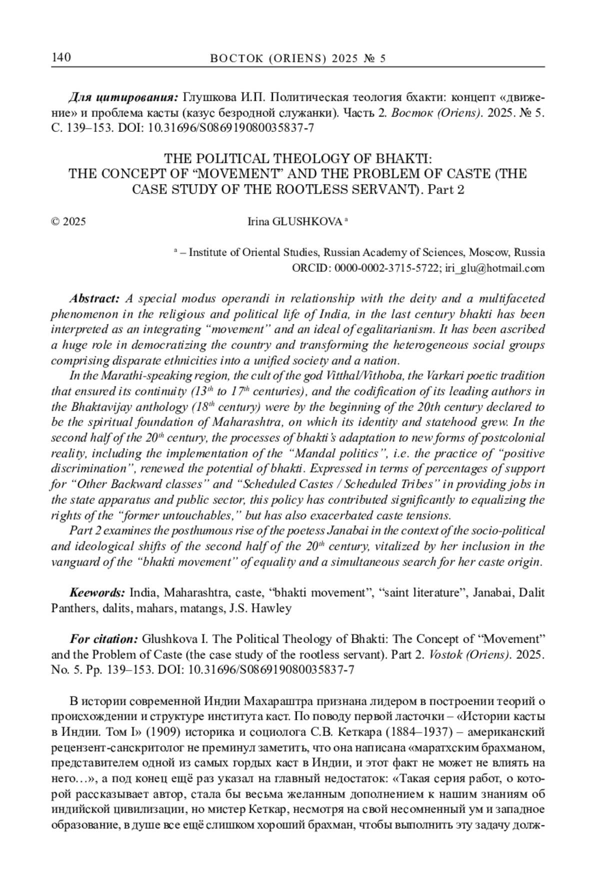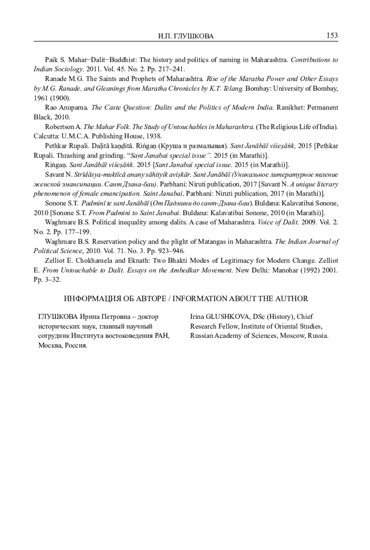 18. Glushkova I. Janabai and Gangakhed of Das Ganu: Towards ethnic unity and religious cohesion in a time of transition. The Indian Economic and Social History Review. 2021. Vol. 58. Iss. 4. Pp. 505-532.