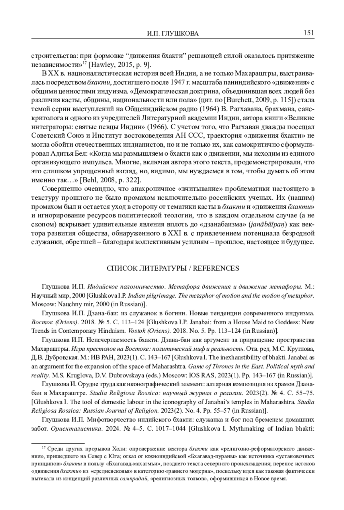 5. Глушкова И.П. Мифотворчество индийского бхакти: служанка и бог под бременем домашних забот. Ориенталистика. 2024. № 4-5. С. 1017-1044. EDN: KWAWQG