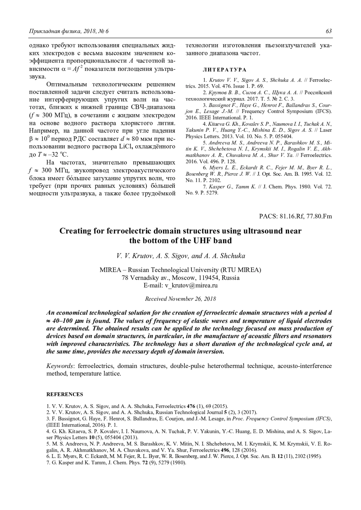 Крутов В. В., Сигов А. С., Щука А. А. Создание сегнетоэлектрических доменных структур с использованием ультразвука вблизи нижней границы СВЧ-диапазона 60
