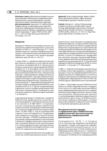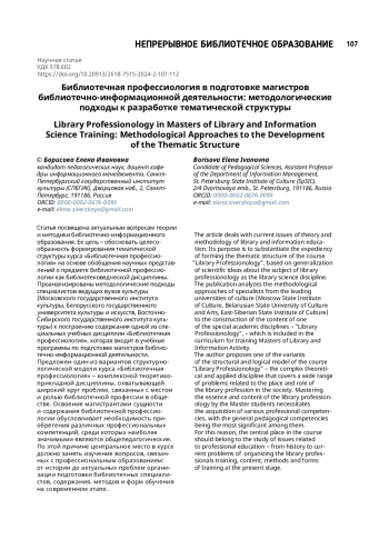 9. Булдина Г. И., Лопатина Н. В. Библиотечная профессиология в структуре подготовки магистров библиотечно-информационной деятельности // Вестник Московского государственного университета культуры и искусств. 2021. № 6. С. 143-150.