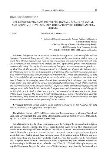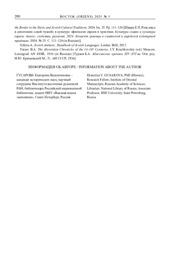 2. Gusarova E.V. The manuscript of the Octateuch from the collection of the Hebrew Academy of Sciences: the legacy of Ethiopian Christians or Falasha Jews? Jews in world history, culture and politics. April 26, 2020. V.G. Vovina, M.O. Meltsin (editors) St. Petersburg: St. Petersburg Institute of Judaica, 2020. pp. 12-17. EDN: RHJFXK