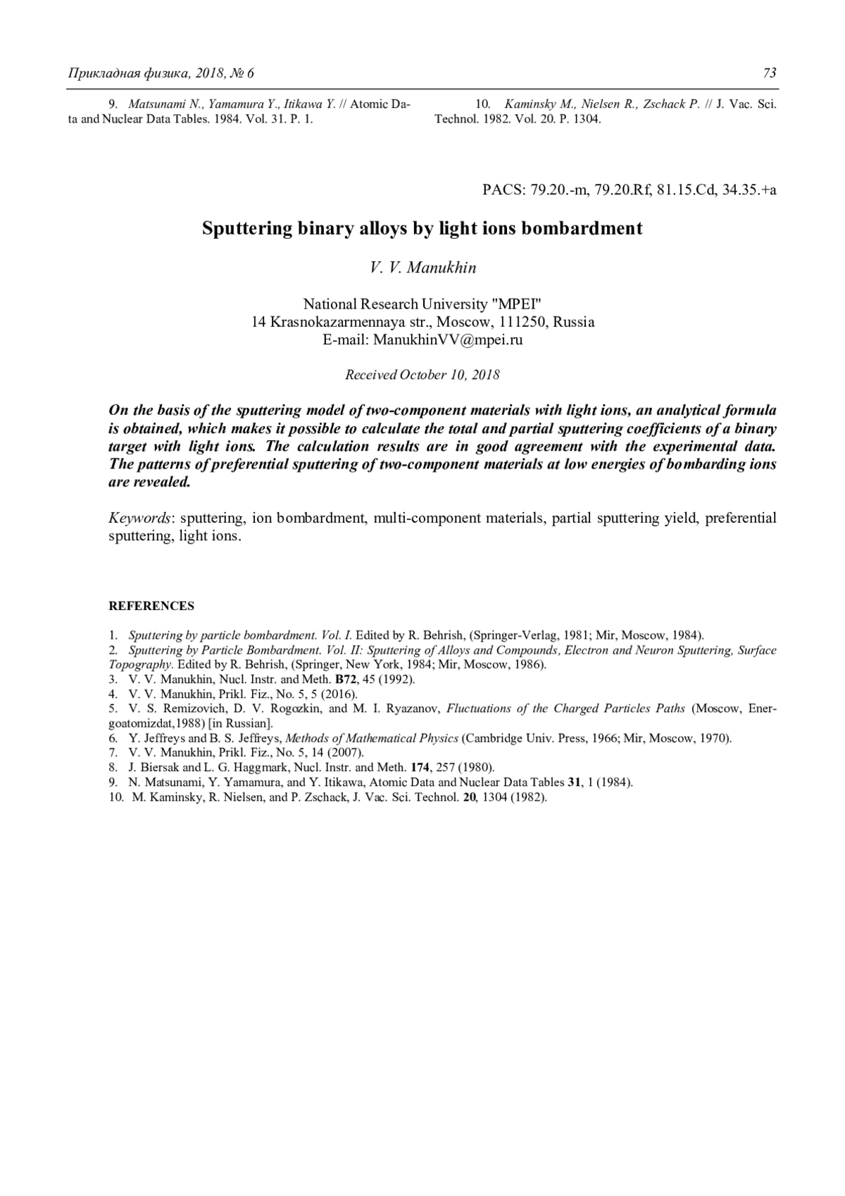 3. Manukhin V. V. // Nucl. Instr. and Meth. 1992. Vol. B72. P. 45.