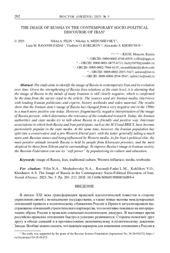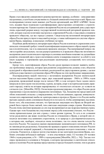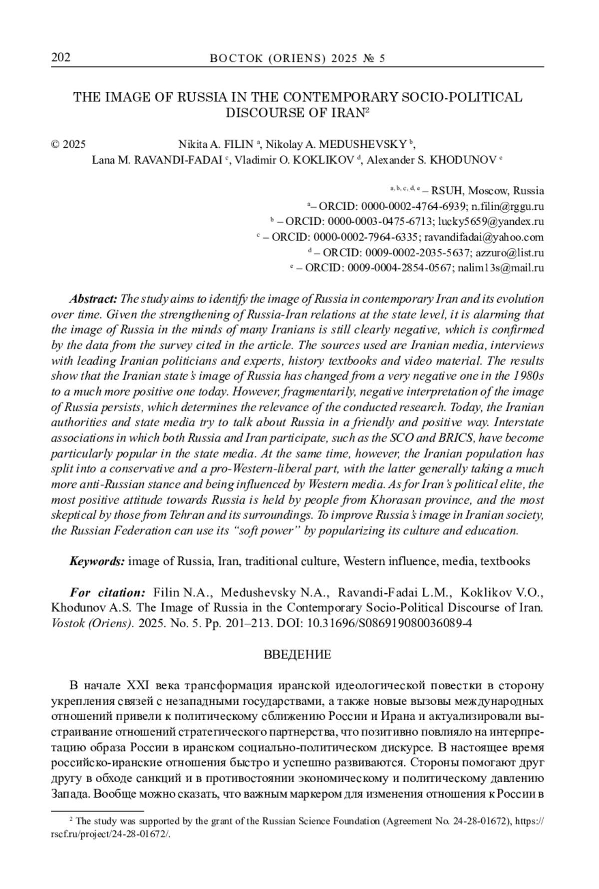15. Филин Н. А., Кокликов В. О. Восприятие России в истории Ирана (по материалам иранских учебников истории). Россия и Иран: Пять веков сотрудничества: сб. материалов международной научной конференциu. Отв. ред. А. Б. Безбородов, В. В. Наумкин, А. К. Аликберов. М.: РГГУ, 2022. С. 191-200.