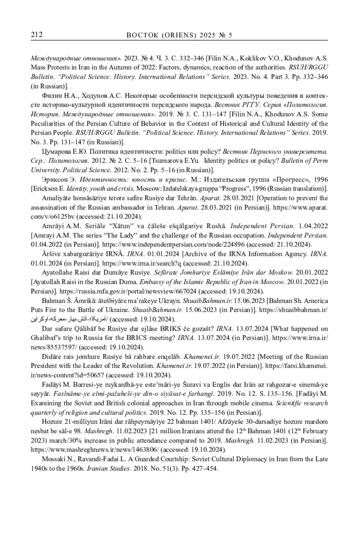 17. Филин Н. А., Ходунов А. С. Некоторые особенности персидской культуры поведения в контексте историко-культурной идентичности персидского народа. Вестник РГГУ. Серия “Политология. История. Международные отношения”. 2019. № 3. С. 131-147.