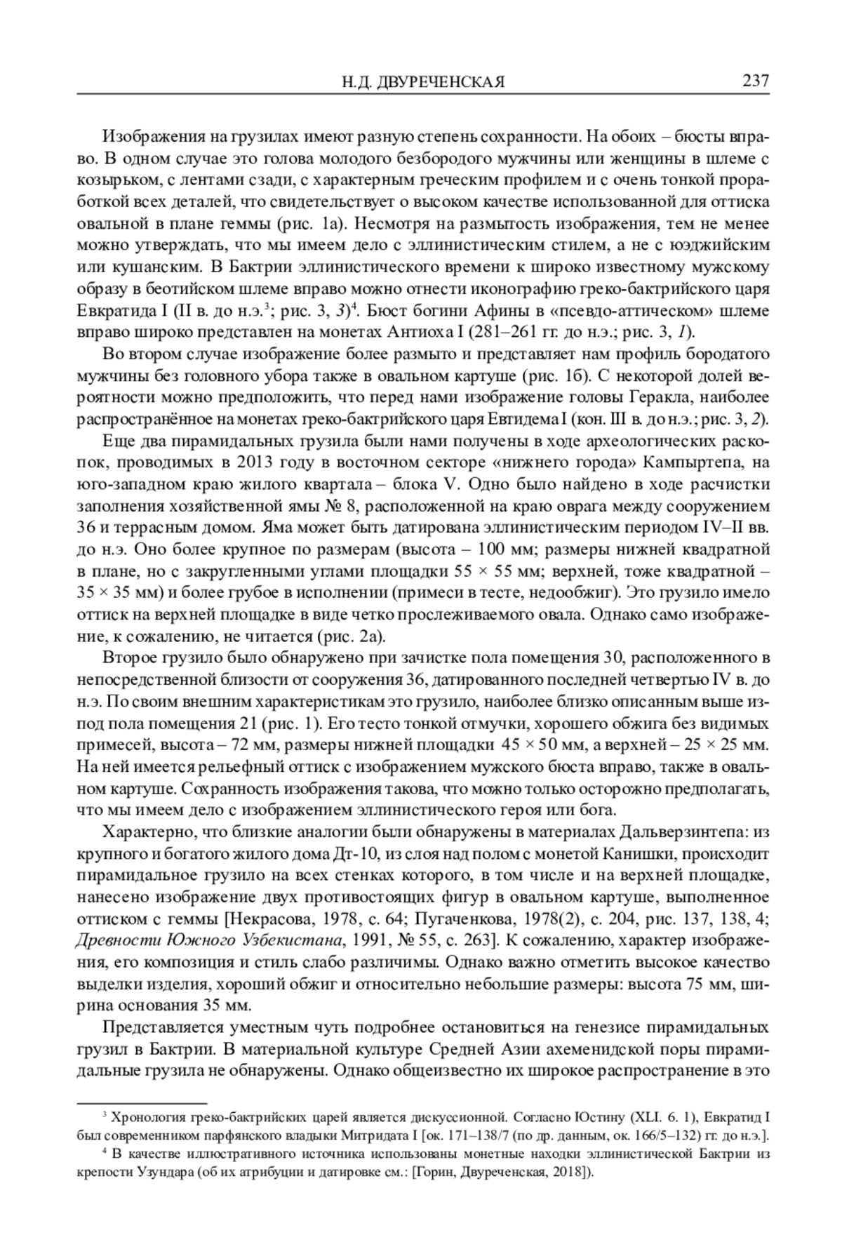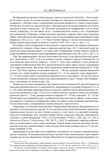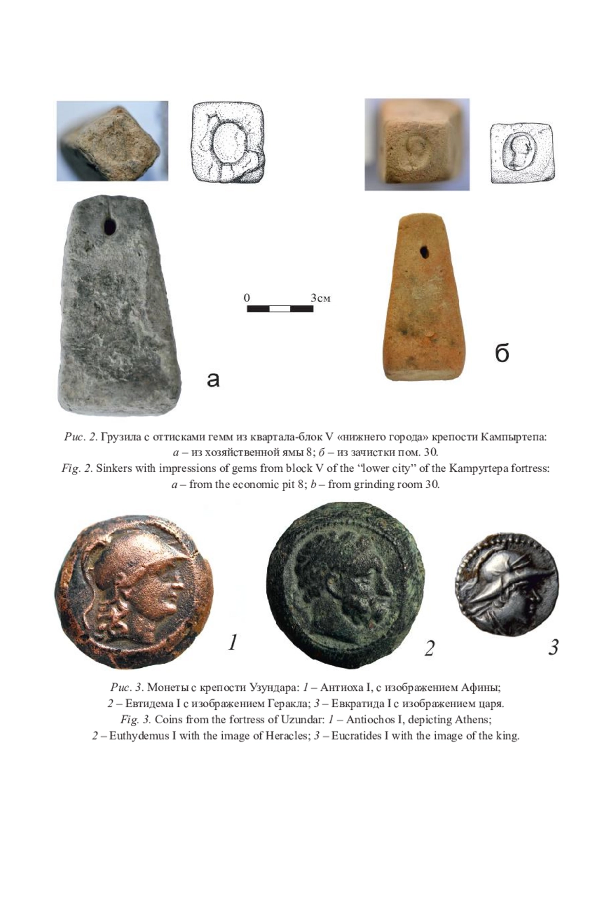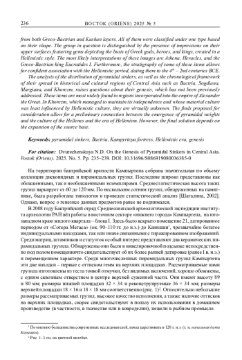 В ст атье исследуется серия пирамидальных керамических грузил из бактрийской крепости Кампыртепа, расположенной на правом высоком берегу реки Амударья (в древности Окс). Ранее на этом памятнике были обнаружены сотни подобных изделий как в греко-бактрийских, так и в кушанских слоях. По форме все они были отнесены к одному типу. Рассматриваемая нами группа грузил отличается наличием на их верхних площадках оттисков с гемм с изображением бюстов греческих богов, героев и царей, выполненных в эллинистическом стиле. В качестве интерпретации изображений наиболее вероятны образы Афины, Геракла и греко-бактрийского царя Евкратида I. Кроме того, стратиграфия части этих изделий позволяет уверенно соотносить их с эллинистическим периодом и датировать IV–II вв. до н. э.